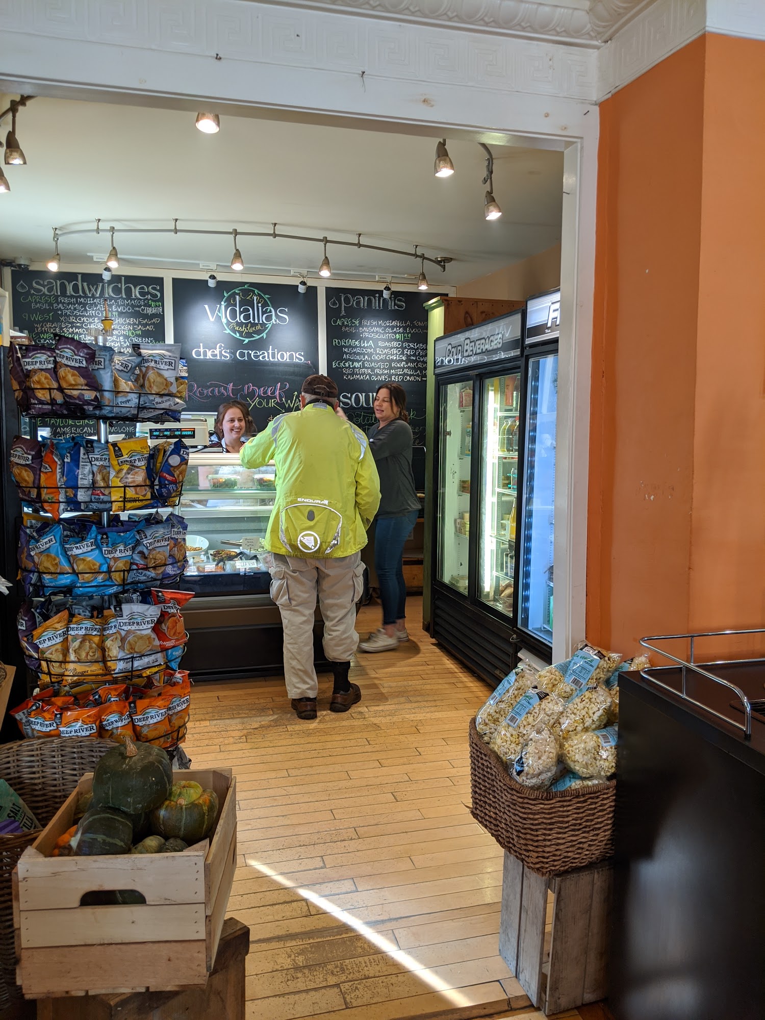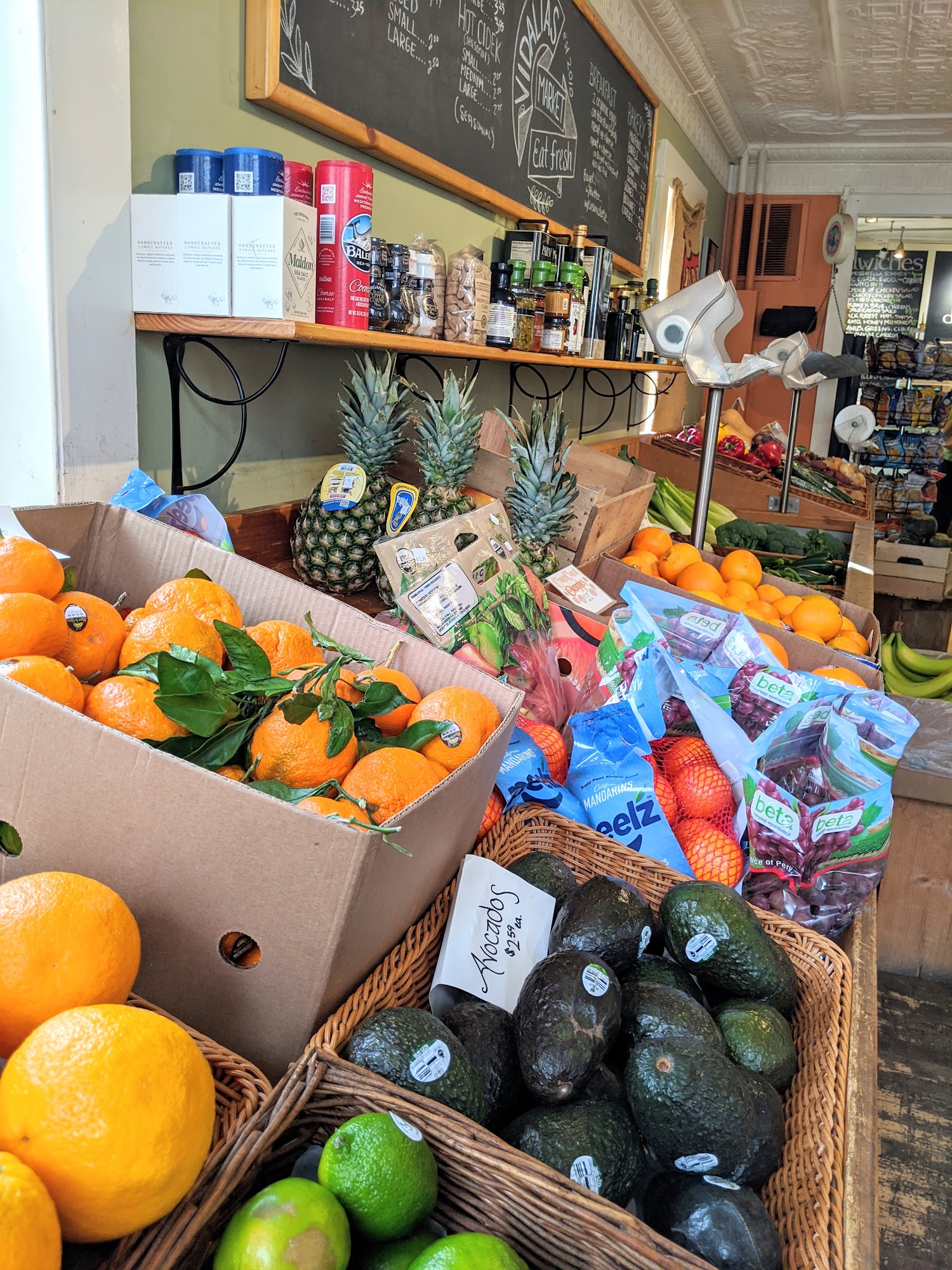 Vidalias is a little spot to grab and go or relax for a few minutes and enjoy the vibe. It serves fresh avocado, egg, tomato and arugula on sour dough that is tasty, with a side of grapefruit. The iced tea is cold and strong. Popular items include the Curried Chicken salad wrap, pickles and grapes, and many yummy foods that can be picked up for dinner or heated at home.