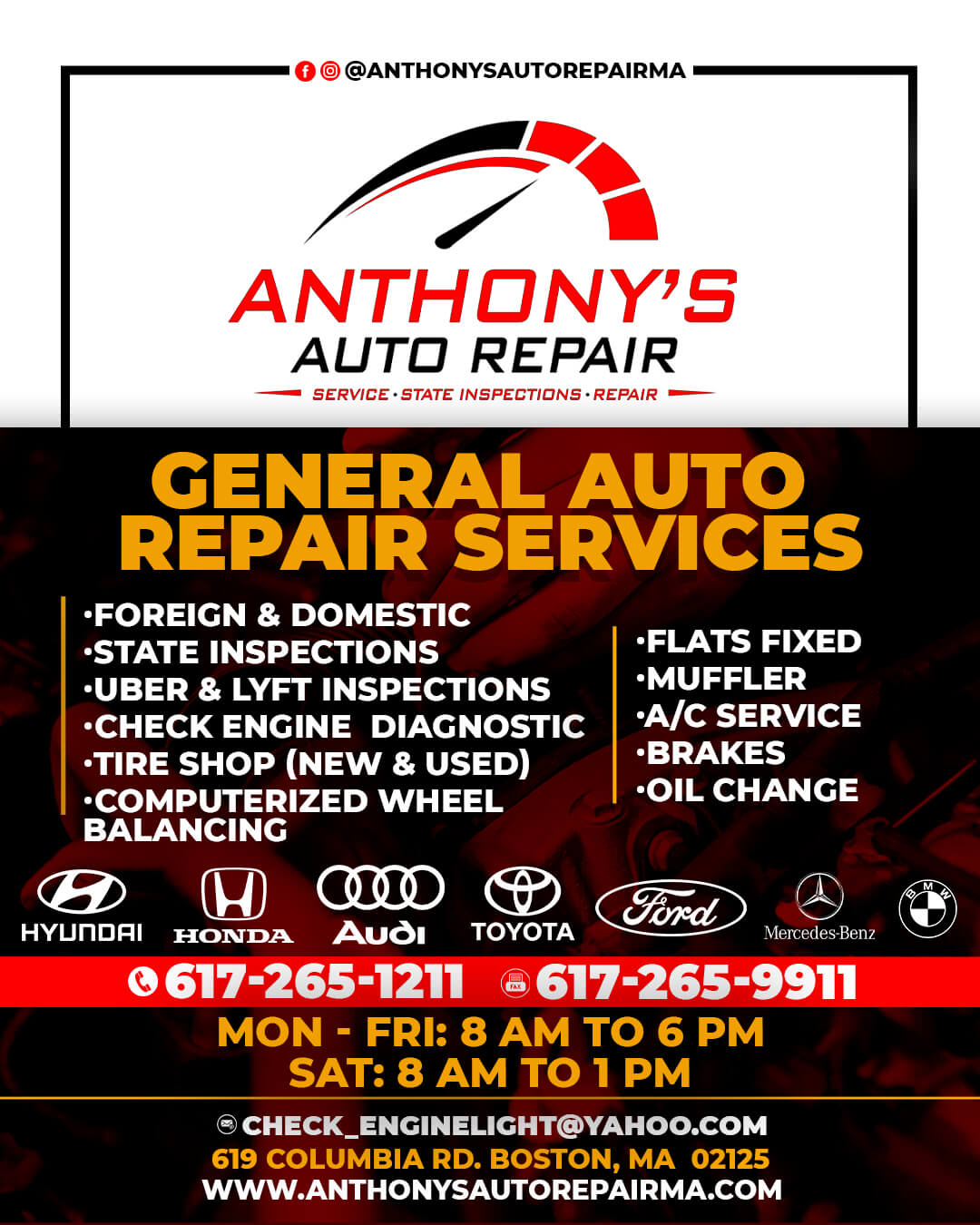 Anthony's Auto Repair provides professional auto repair services for foreign and domestic vehicles. The shop is known for amazing service, great pricing, and a knowledgeable, friendly, and professional staff. Customers report being treated fairly and receiving the very best of service, often completing work like tire patches or inspections swiftly. The team is customer driven, offering prompt communication and affordable pricing for everything from oil changes to brakes and general repairs. The receptionist provides great customer service. Many customers are highly satisfied, recommend the shop, and plan to make it their go-to auto repair establishment.