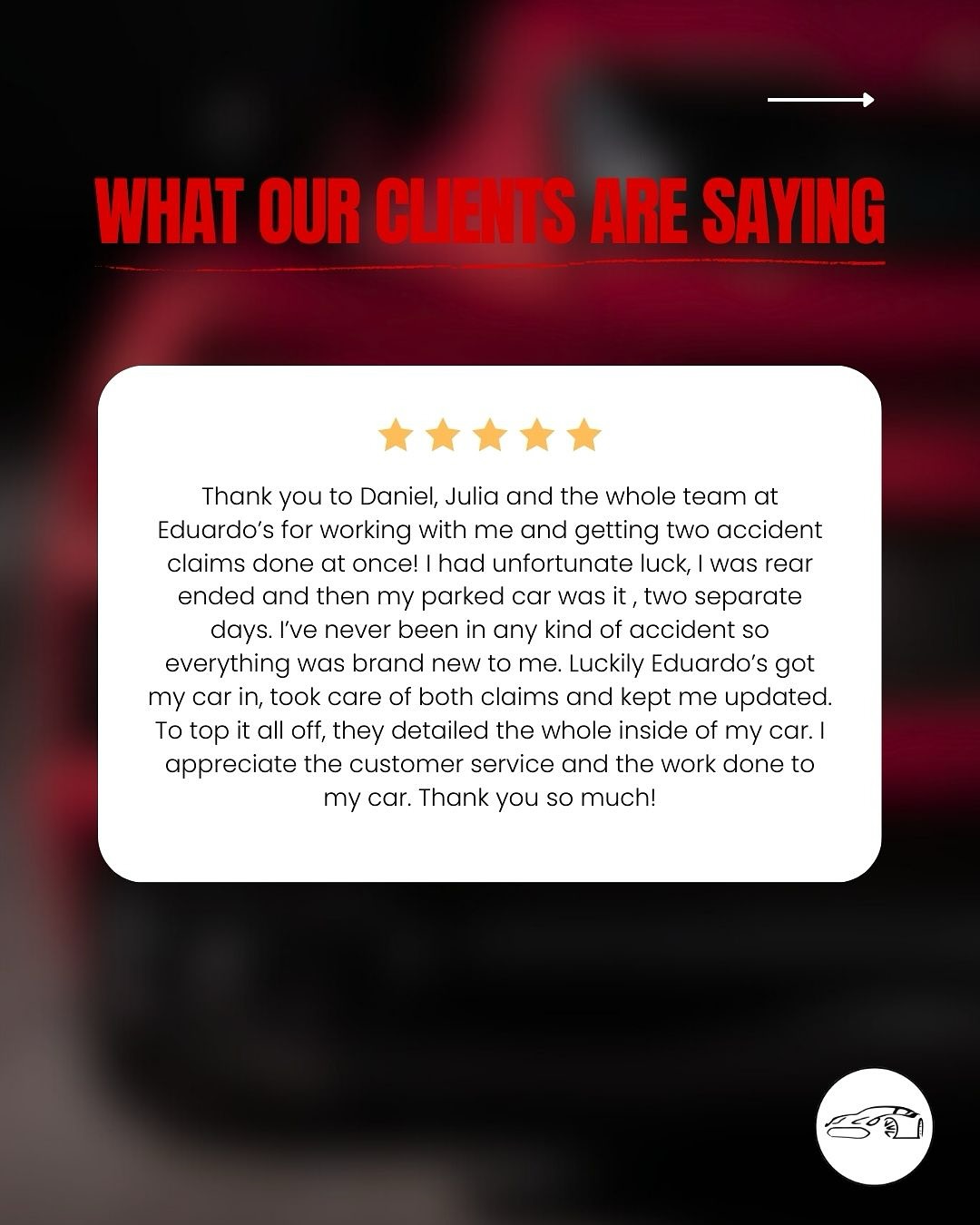 Excellent service and professional. The staff at the front desk were great as well. My car looks brand new! I truly recommend this shop. They even detailed it! Thank you again for the amazing work!!