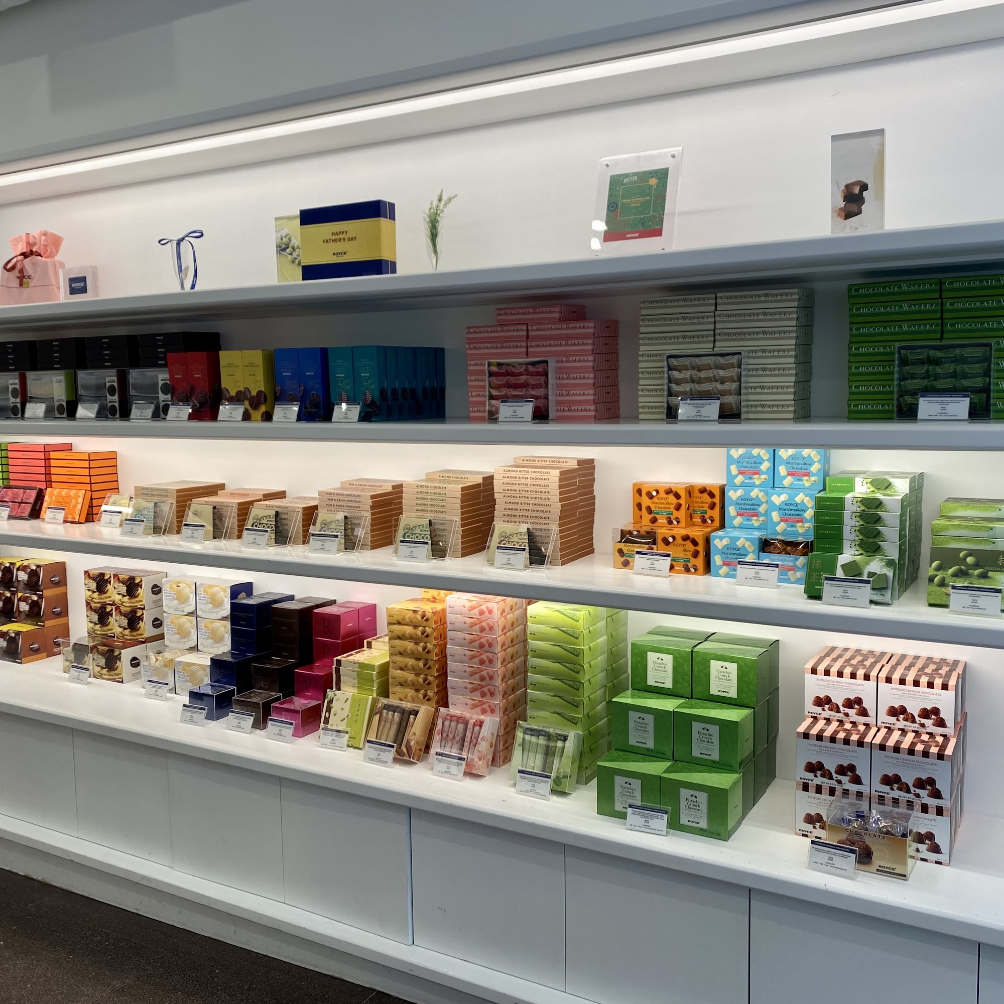 ROYCE' Chocolate Boston is a boutique on Newbury Street offering fine Japanese chocolates fresh from Hokkaido. The shop is very clean with well-organized displays and a chic interior. The chocolates are fantastic, amazing, and simply the best. They are high quality, made with natural ingredients, and are much creamier with a deep flavor, unlike typical U.S. chocolate. Popular items include the signature Nama Chocolates, which are soft, cream-infused, fudgey treats, along with pure chocolate wafers, chocolate-covered potato chips, mango chocolate, and matcha chips. The staff are friendly, helpful, and very knowledgeable about the chocolate flavors and allergen information. They provide outstanding service, going above and beyond to assist customers. Samples are available and are highly recommended. The prices are reasonable given the quality and refrigerated transport from Japan. This location provides a convenient way to enjoy these beloved treats without having to travel halfway around the world.