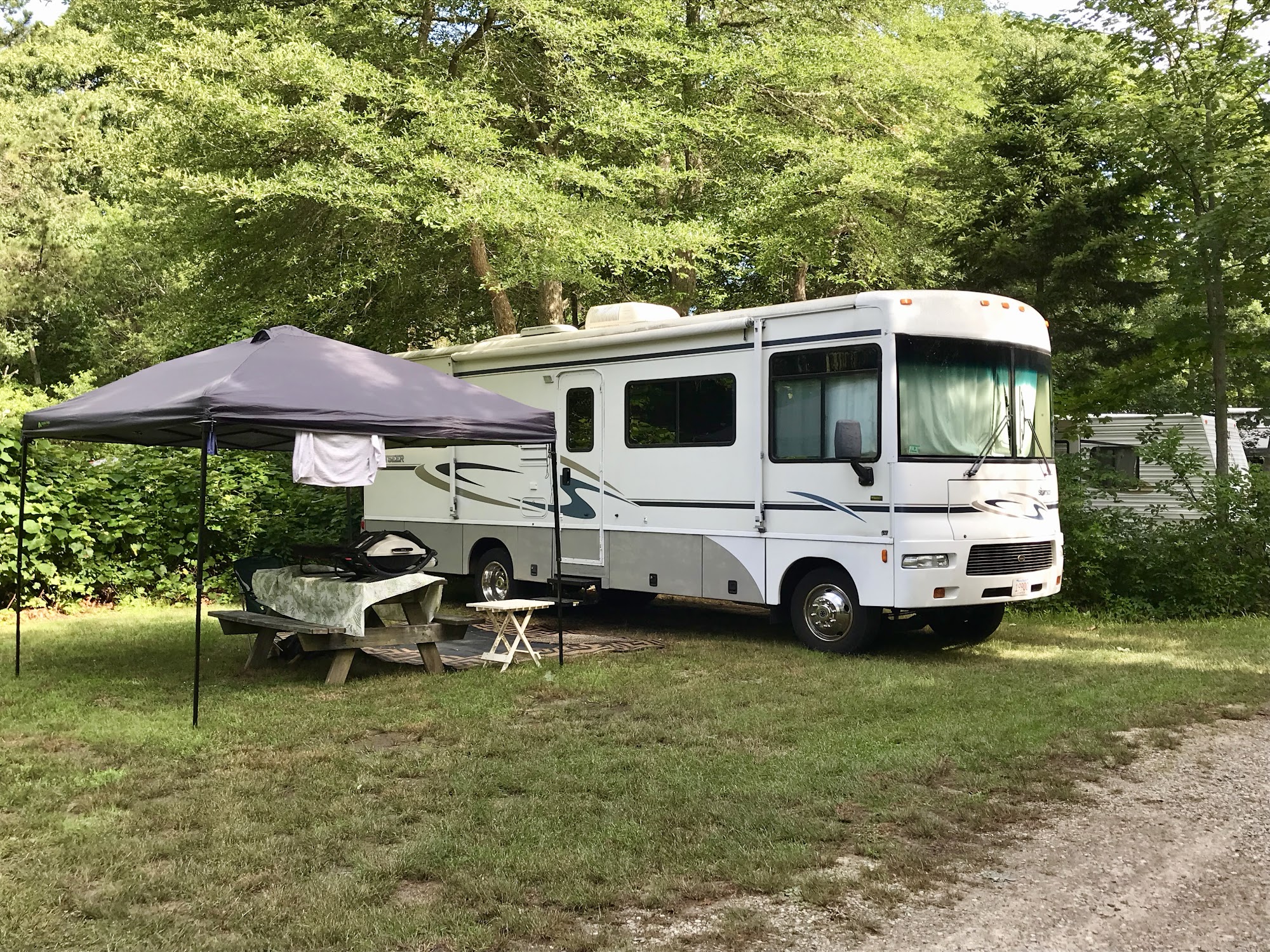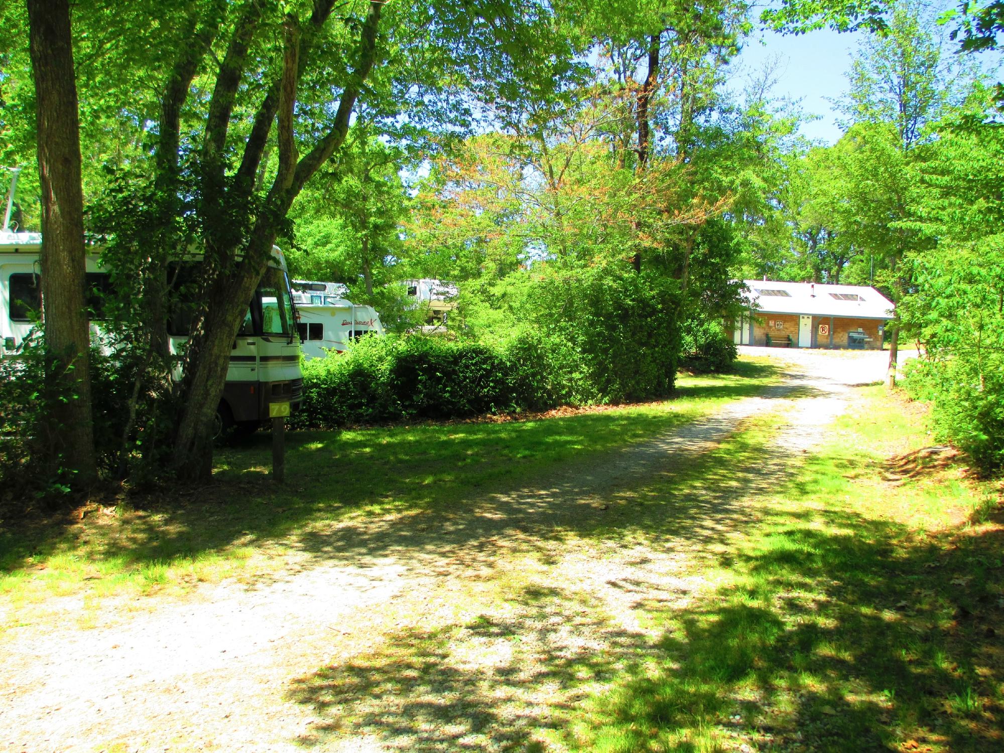 Not exactly big rig friendly, but a normal sized class B or C can find a nice, cozy, and private space. You can also walk on sidewalks to several restaurants, and it's close to the rail trail which makes for good biking.