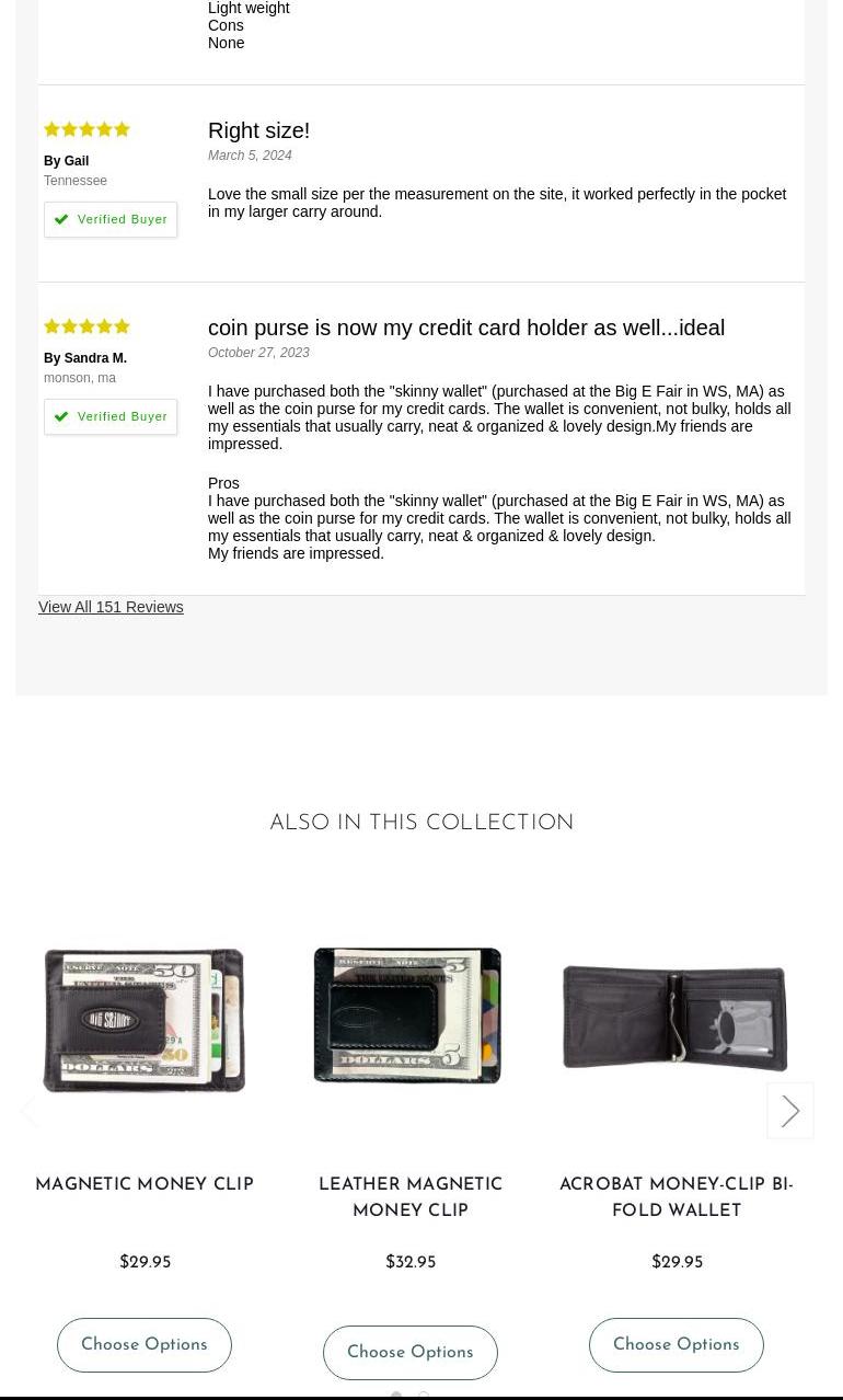 Big Skinny Wallets are the best wallets. They are of good quality and very thin. The company is honest and fixes problems quickly. Big Skinny Wallets are perfect and reasonably priced. They can hold many cards and are not bulky. The wallets are available in different styles, such as bi-fold and tri-fold, and have features like clear front pockets. Big Skinny Wallets are strongly recommended and have been used by customers for many years, with some using them for over 8 years.