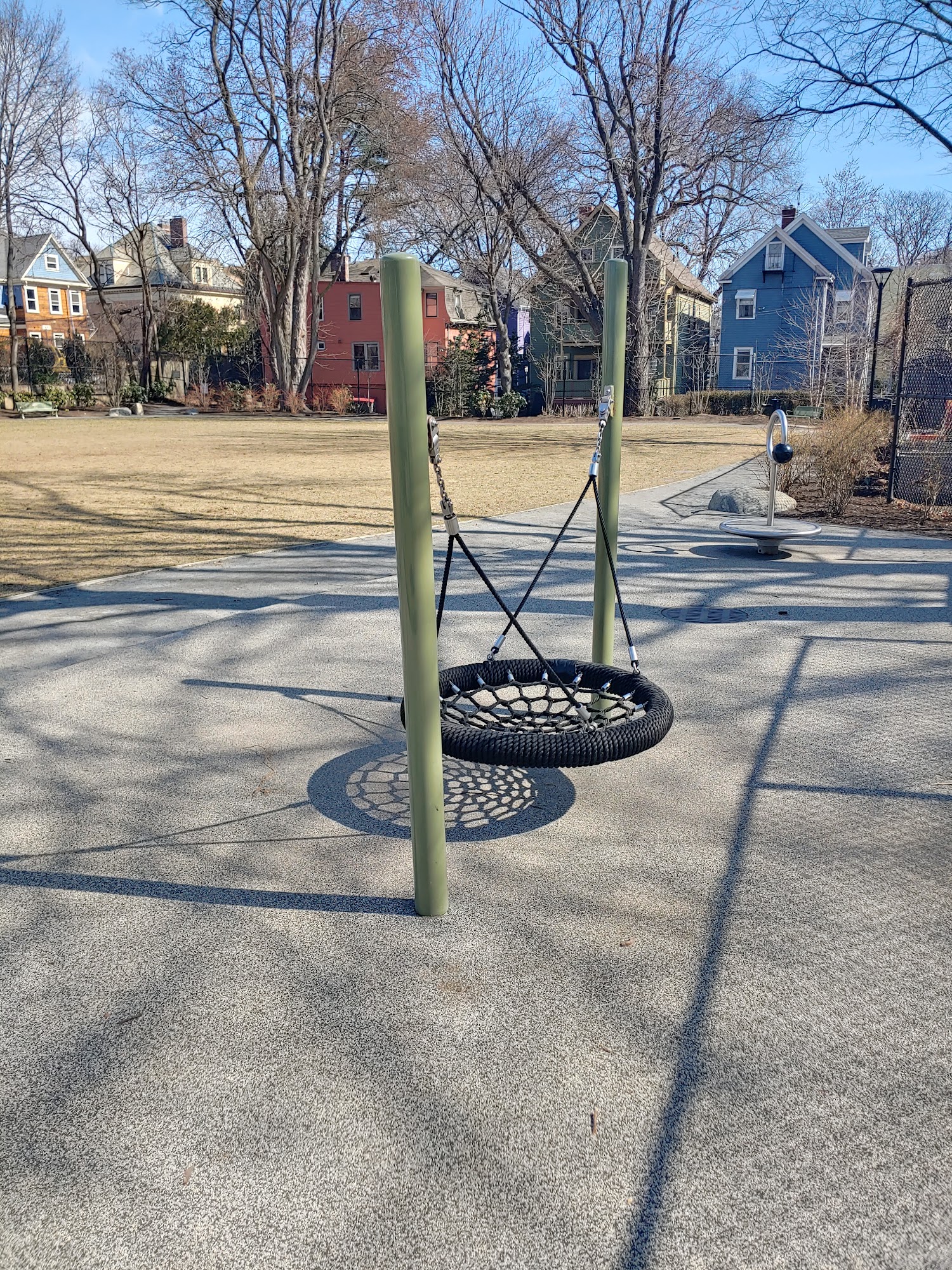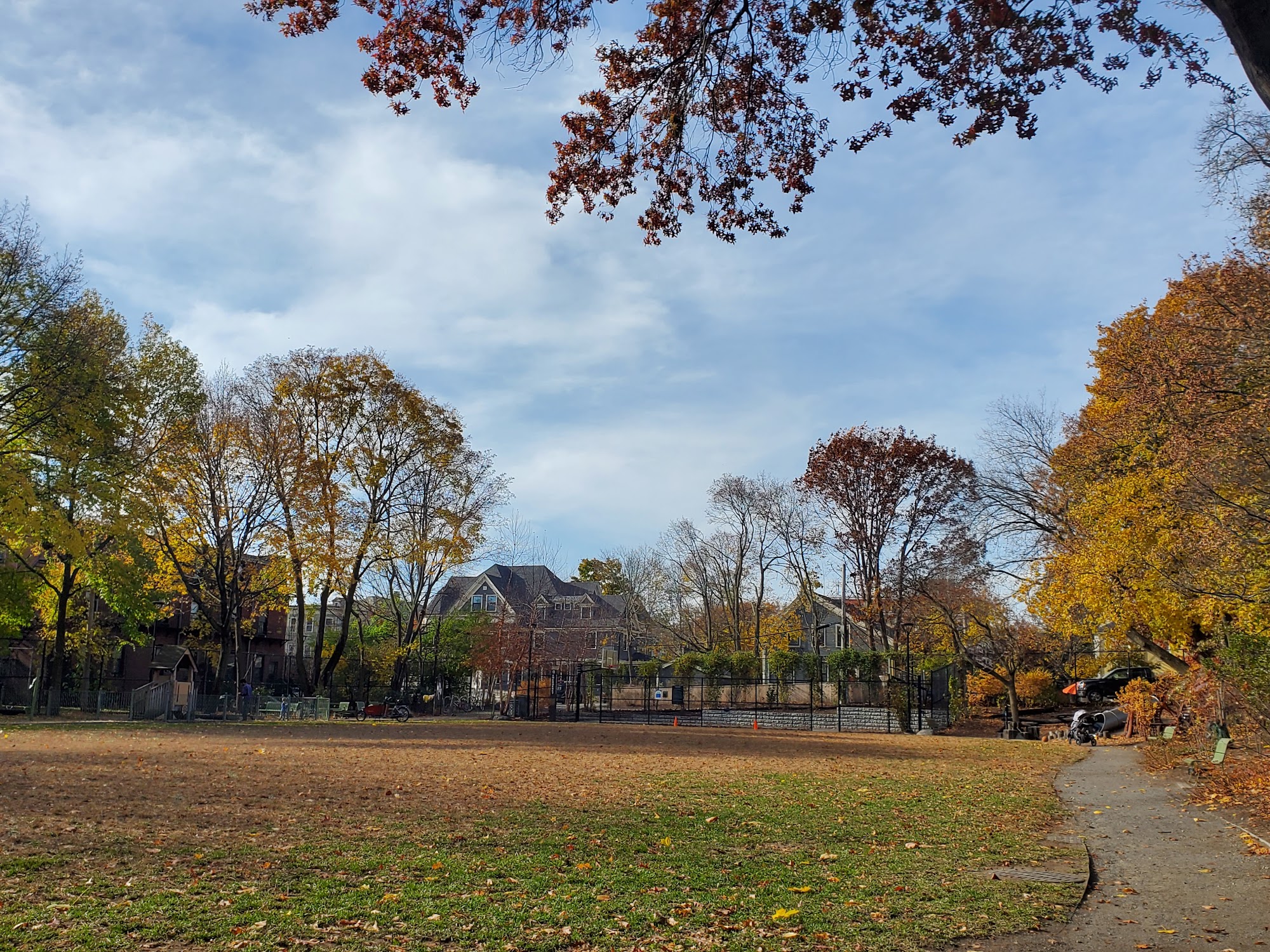 Small gem of a park. Large open field surrounded by trees and a garden. I think there is a basketball hoop tooDog-friendliness: Large space where you and your dog can run and play. On leash of course