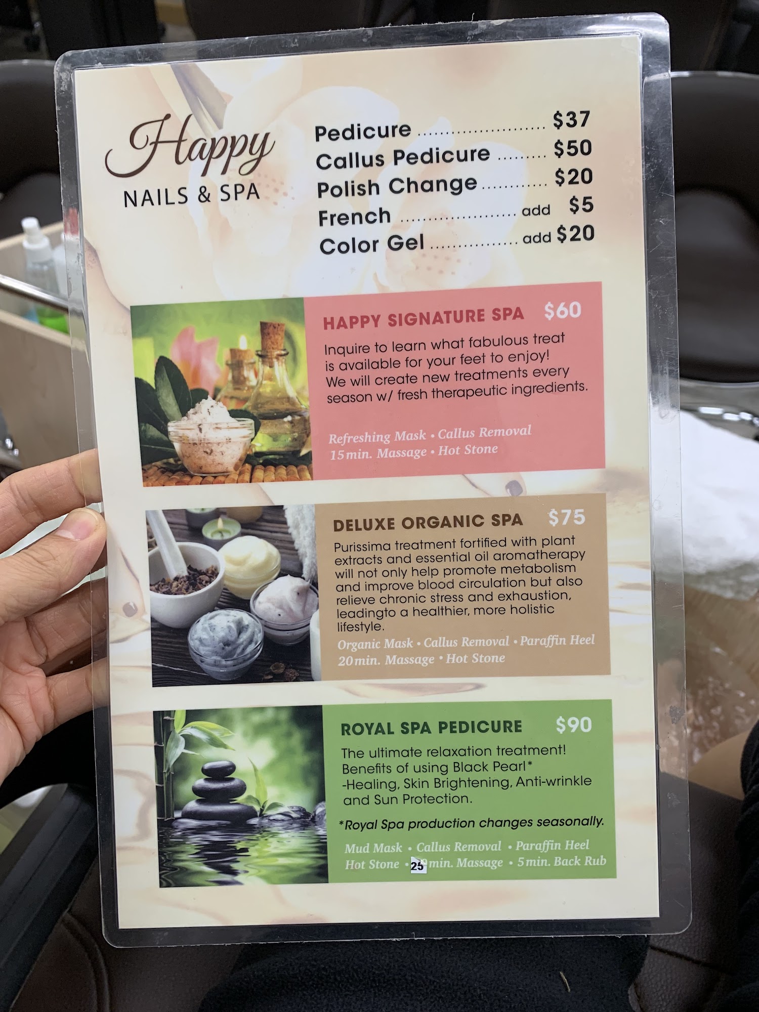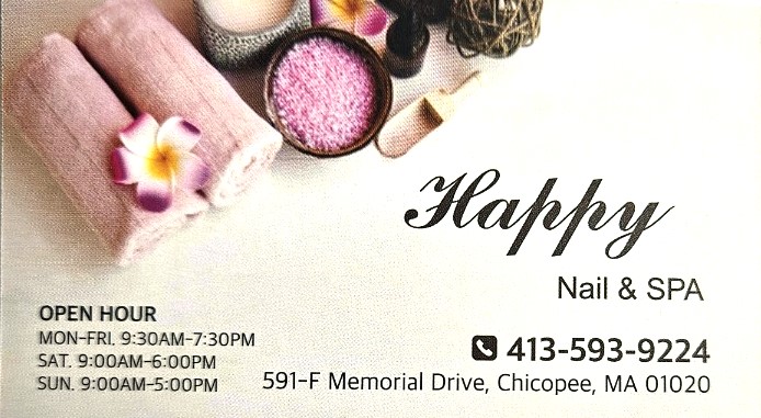 Happy Nails & Spa, located in Chicopee Plaza, is a nail salon that values hygienic practices, quality work, and cleanliness. Customers can expect a wide variety of colors and services, including the Happy Signature Spa Pedicure, which offers a relaxing experience with mask, callus removal, hot stone, and a 15-minute foot and leg massage. The atmosphere is calming and serene, with soft instrumental music playing, creating a peaceful environment. The staff is friendly and attentive, making sure clients feel comfortable and pampered. Services include foot massages, pedicures, and gel manicures that last well. Customers also enjoy additional touches like a neck and shoulder massage while nails dry, and the bathroom is always immaculate. Overall, Happy Nails & Spa provides a clean, relaxing, and enjoyable experience at an affordable price.