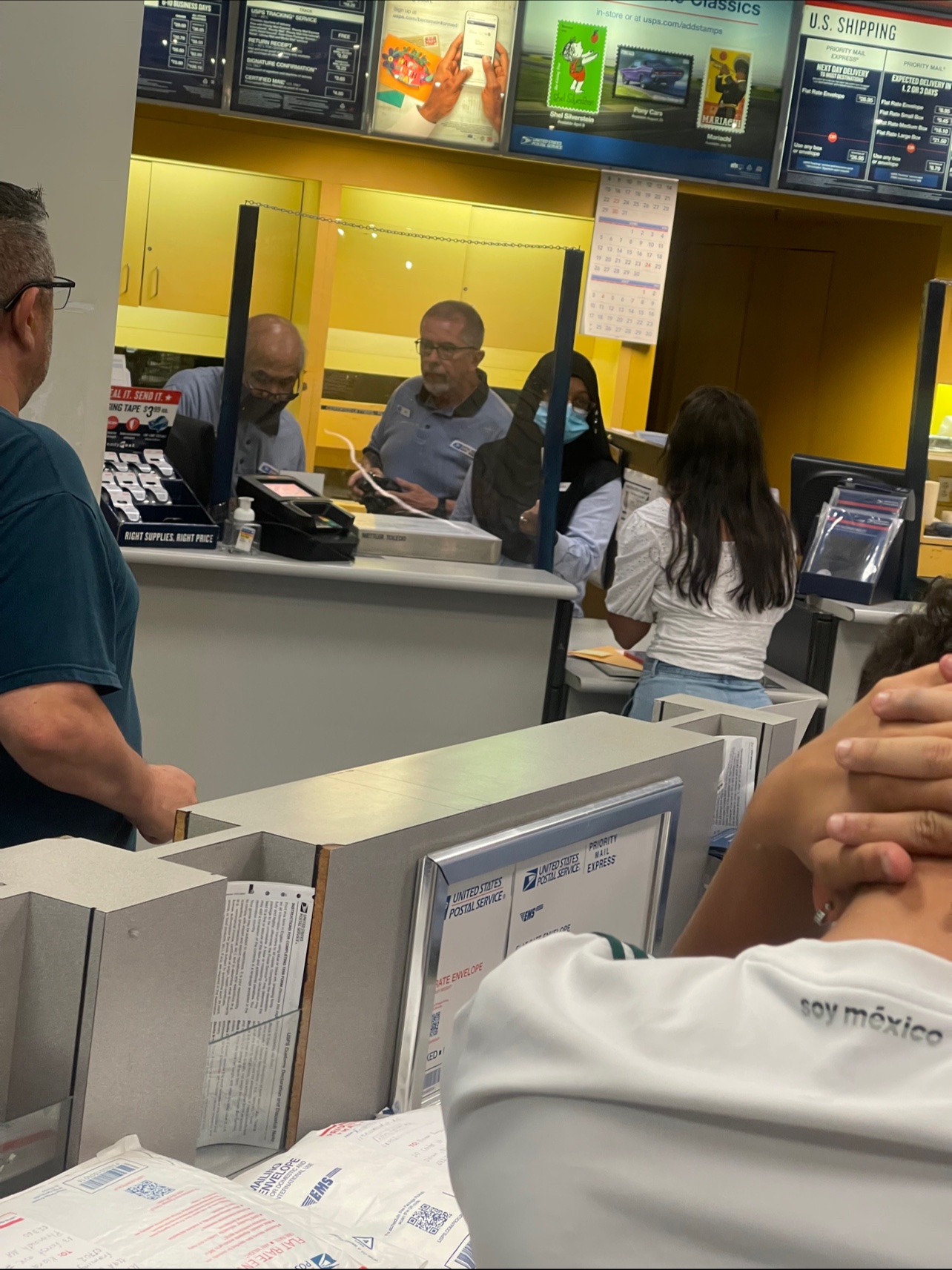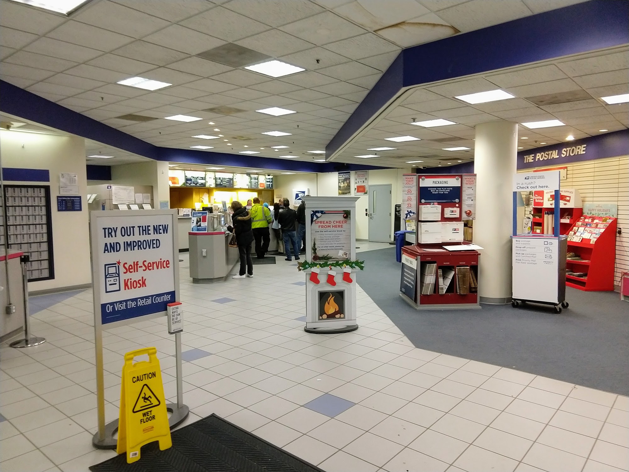 The self serve package station is great; you can buy a box, seal and address your package, print the label, and leave your package behind a protected drop off wall slot thing. No talking or waiting in line necessary.