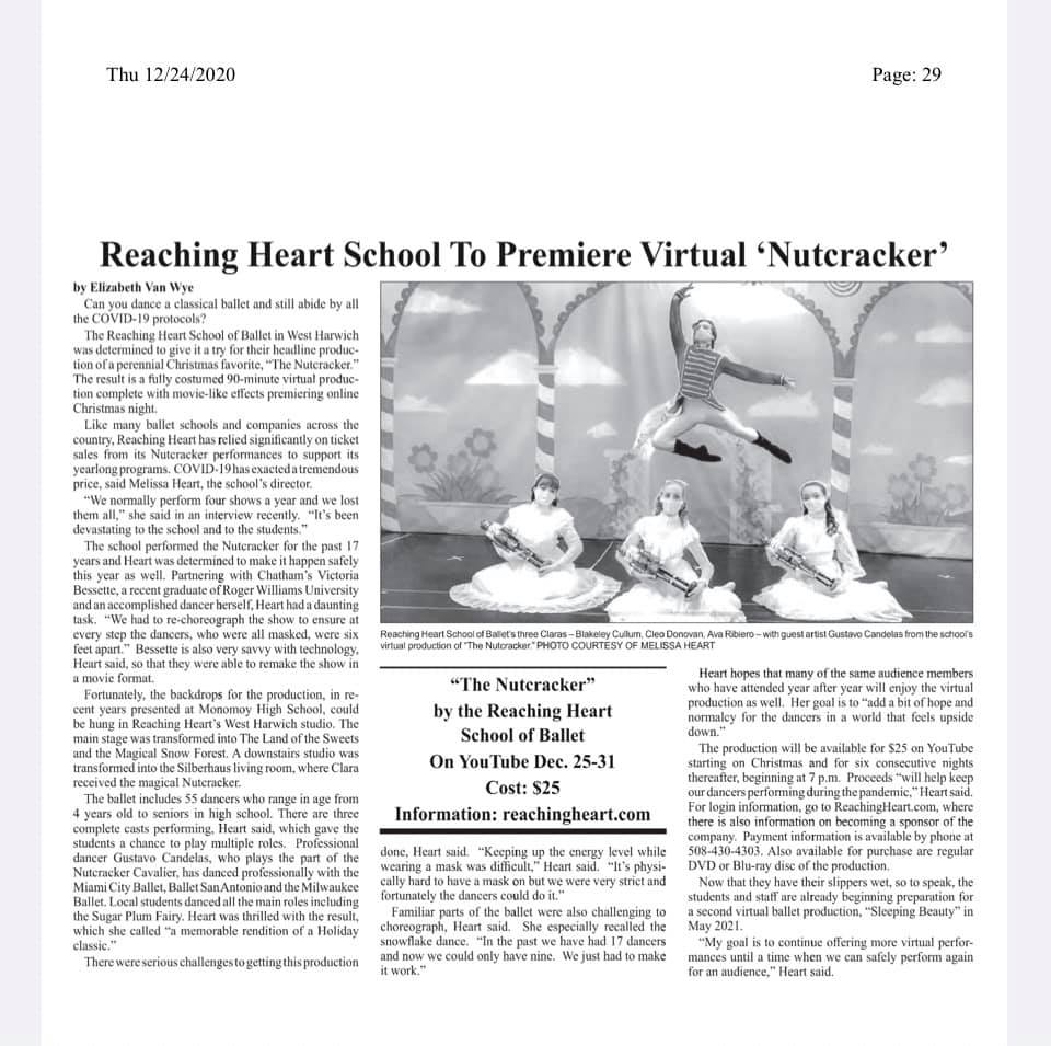 Reaching Heart School of Ballet is a unique dance studio located in West Harwich, MA, in the heart of beautiful Cape Cod. The passionate instructors are dedicated to sharing their love of dance with students of all ages and skill levels, from beginners to pre-professional dancers. The studio's inclusive philosophy ensures that there are classes to suit all tastes, and they are happy to accommodate students' needs. Whether you're new to dance or have years of experience, the well-trained teachers and thoughtful classes aim to take your skills to the next level. The studio is known for its exceptional instruction and welcoming, supportive atmosphere. Many students have been part of the Reaching Heart family for over a decade, developing lifelong friendships and performing in numerous productions, including the Nutcracker, Cinderella, and Sleeping Beauty. Reaching Heart School of Ballet is not just about learning ballet; it also teaches valuable life skills such as a strong work ethic, perseverance, commitment, and athleticism. The positive and supportive community makes it a special place where students can grow and thrive. Call Reaching Heart School of Ballet to experience the magic for yourself.
