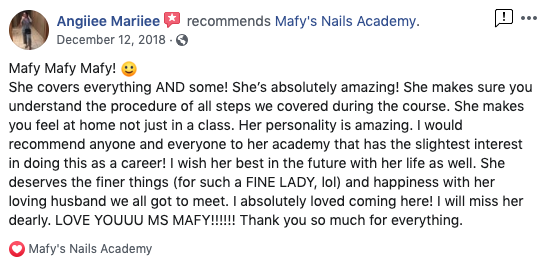 The best decision that i made this year is to choose mafy's nail academy. The teachers are so kind respectful and very fun to learn from, the school is very clean and the atmosphere in the classroom is so awesome. If you ever need a nail tech school don't think twice Mafy's nail is your choice.