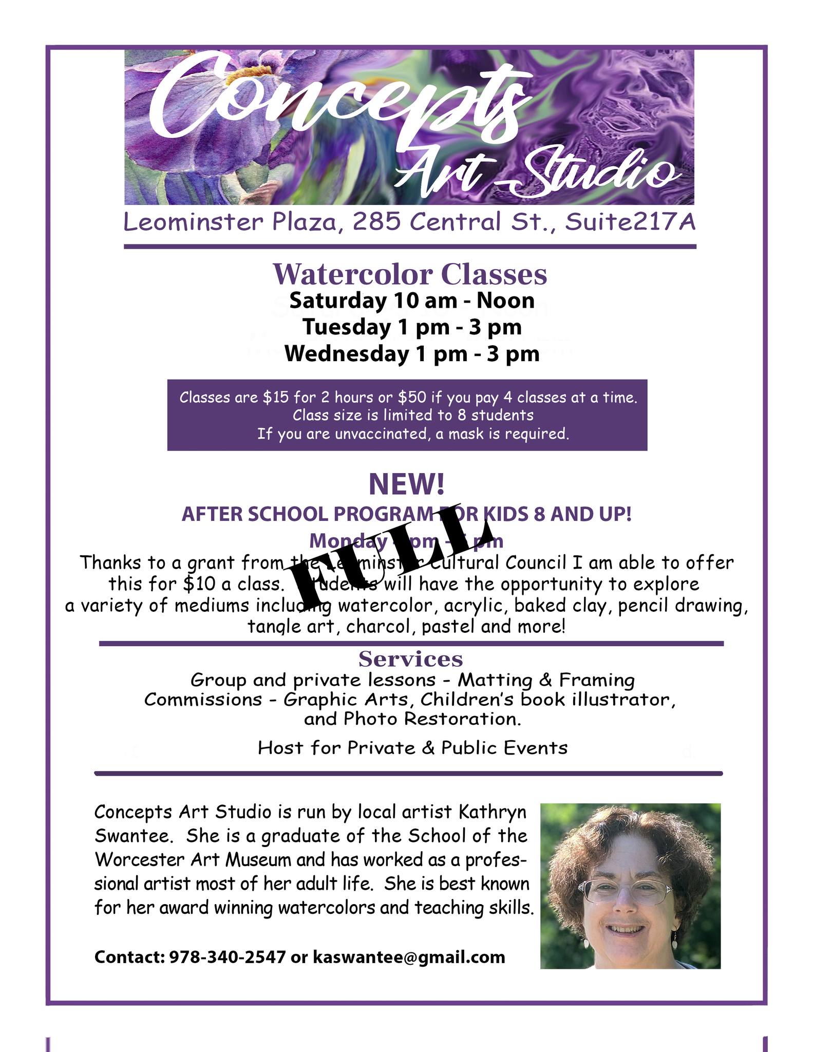 The studio owner is a lovely woman & painter. My son and I have taken a few watercolor classes here now and he loves it (13 years old)