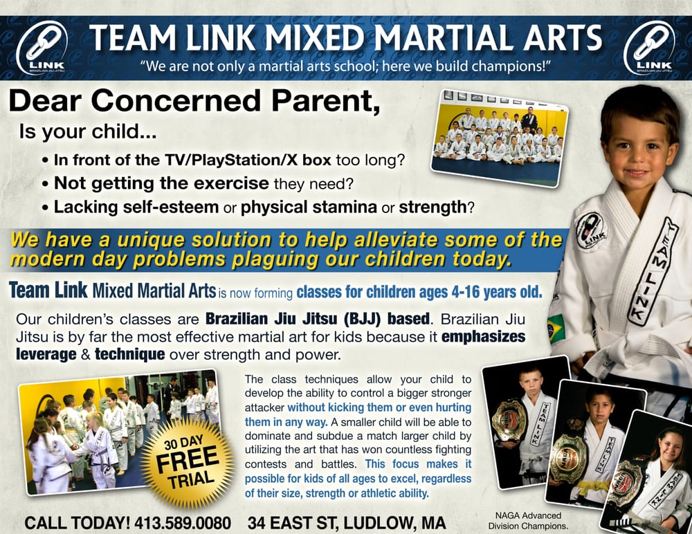 Brazilian Jiu Jitsu and MMA for adults and children in Western Mass. Learning Martial Arts at Team Link: Self-Discipline, Get Active ,Setting Goals, Respect, Listening, Increases self-esteem and confidence. If you are in the Springfield MA area try the number 1 Martial Arts gym!