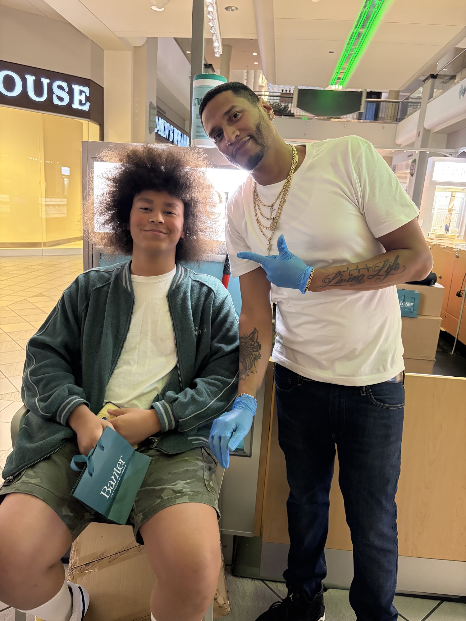 Banter kiosk offers free ear piercings with purchase of piercing jewelry every day. Book appointment online or calling in, just come on in. Walkâins. With over 60 years expertise the OGs of ear piercing help find perfect placement and complement your style. Customer had great experience, supportive and fun. Perfect bracelet gift, beautiful earrings and ring, comfortable and enjoyable ear piercing. They find the skill and care made the experience exactly what they wanted, happy with it. The kiosk offers excellent customer experience, super nice salespersons, helpful and beautiful.