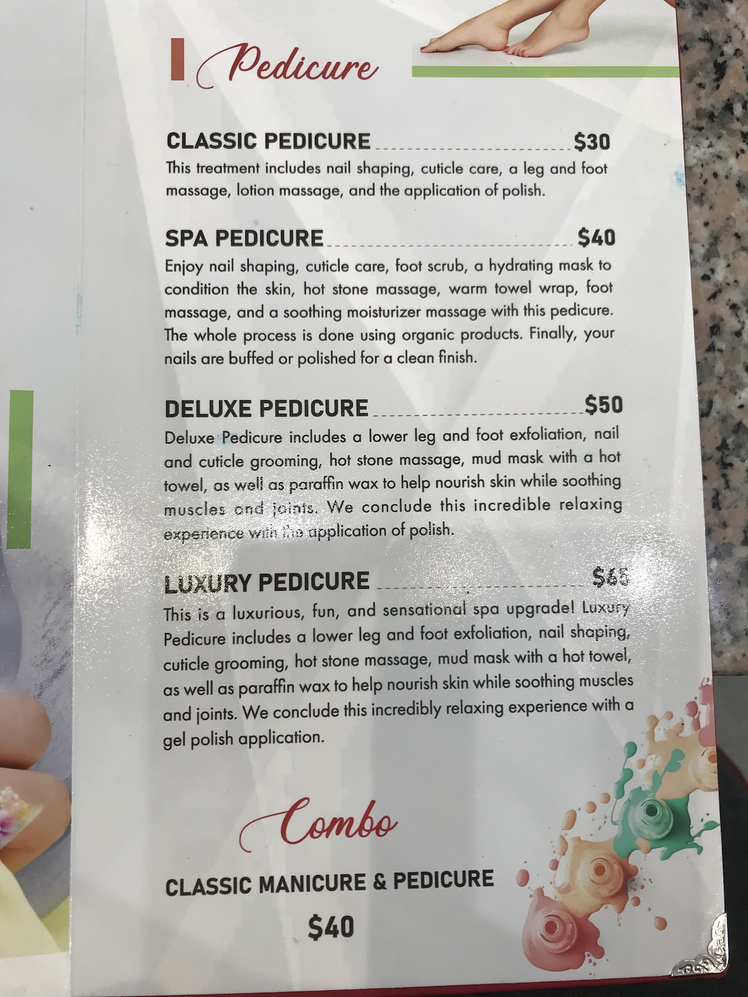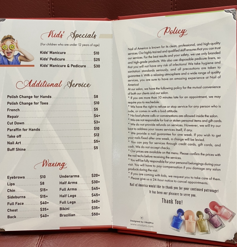 It had great service very pretty ladies. She was so nice and so gentle doing my nails and they look and feel great.