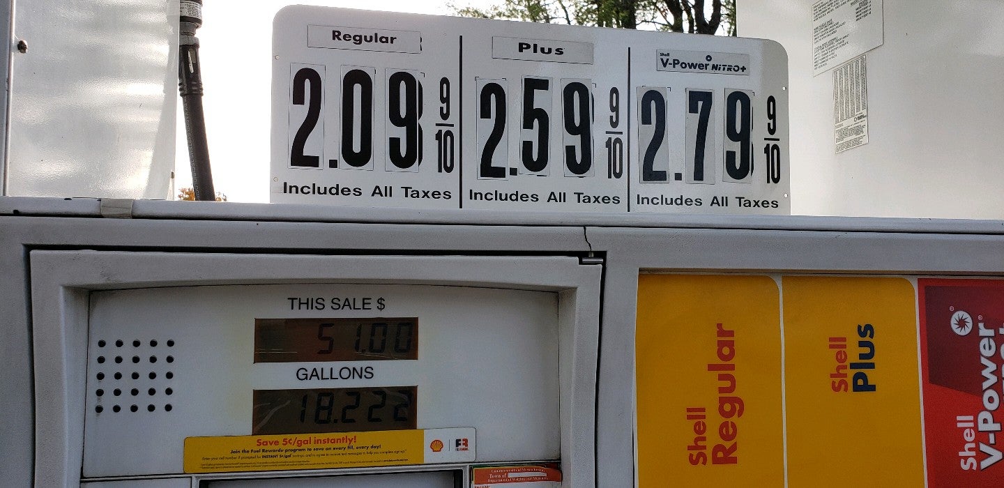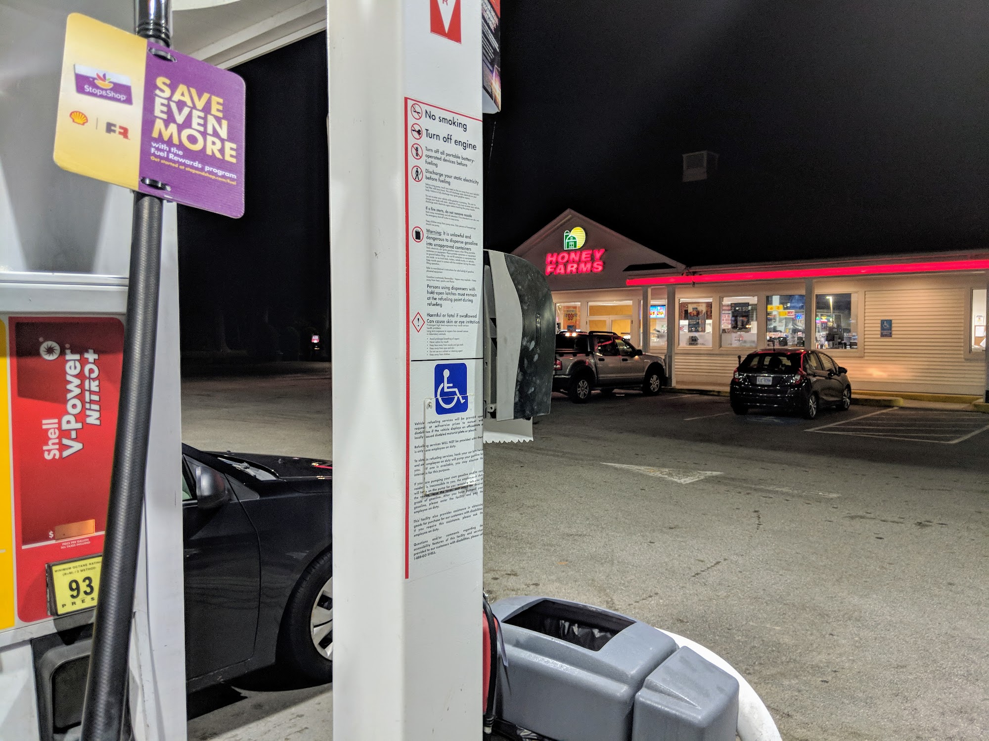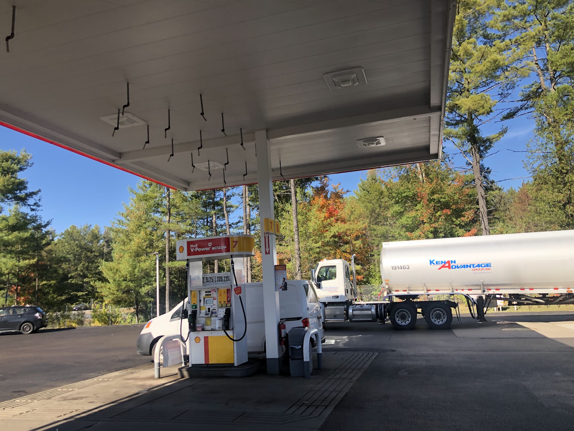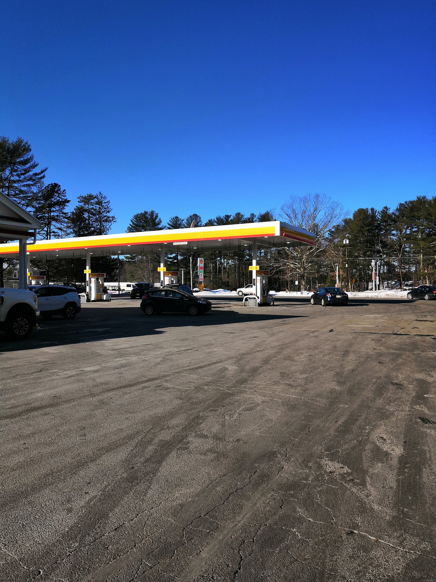 Several bays are available for gasoline and a couple separate bays for diesel. It has a convenience store where cash can be prepaid for gas. You can point out the window to show which bay or read the number.
