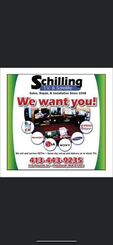 Schilling TV is celebrating 75 years of serving the Berkshires!! Complete Home Theater installation and service, 4K 8K TVs, Audio solutions, Tv Antennas, Cellphone Antennas, satellite tv, custom installation, video surveillance. WIFI setup and improvement solutions Quality and trusted companies: Sony, Samsung, LG, Yamaha, Denon, SONOS, Polk, Dish Network, HughesNet, Channel Master We sell and install quality TVs Delivery and setup Sound Bar available for residential and commercial Commercial Phone systems for business/restaurants Residential and Commercial audio/video services We do the work, so you don’t have to!!! We want you, so please call or stop by, and please tell your friends