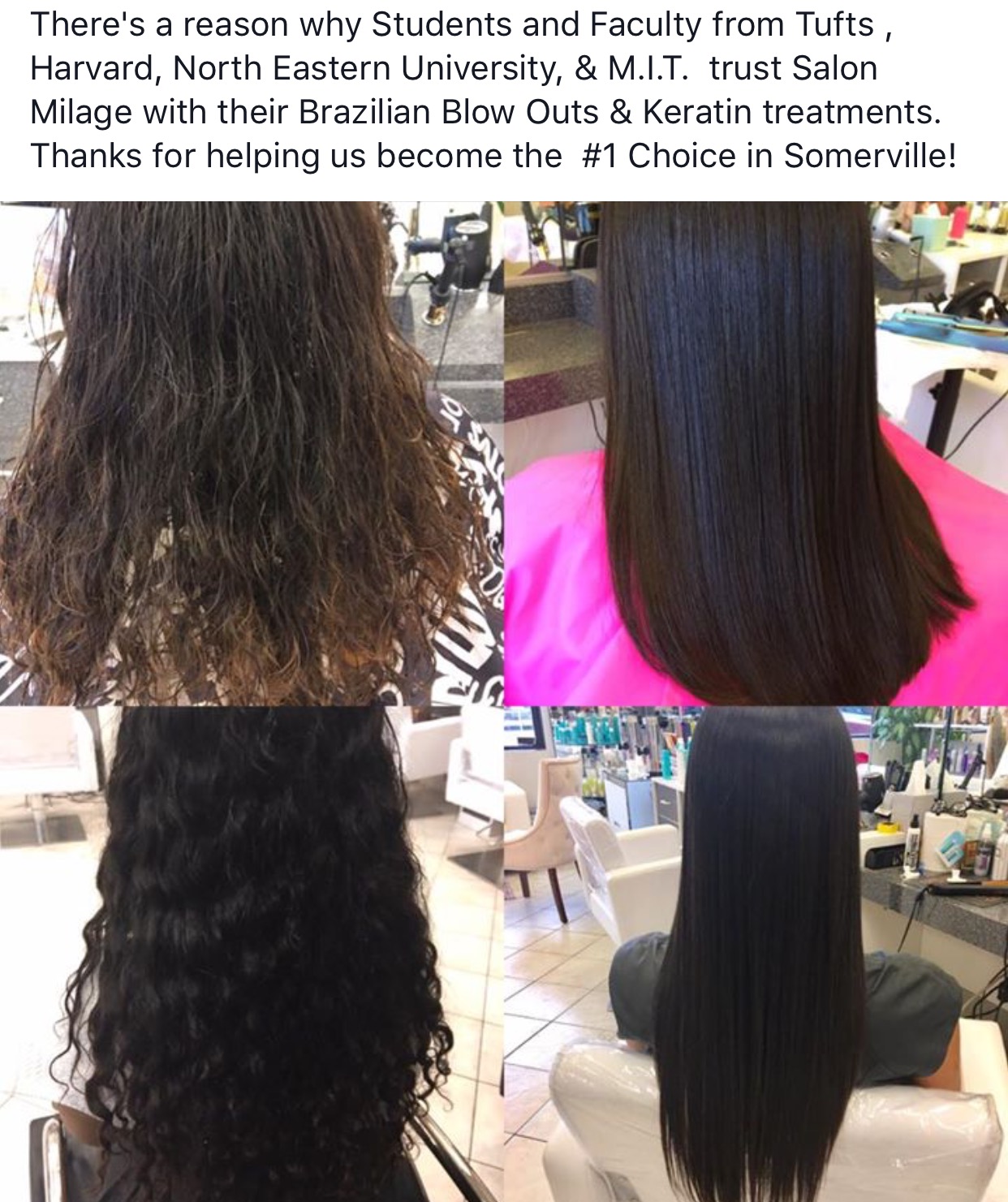 Salon Milage, a popular hair salon in Somerville, offers the latest trends in the industry. This family-run, woman-owned, bilingual business provides top-quality hair services, including cutting, retouching, and Brazilian blowouts. The salon is beautifully decorated, clean, and elegant, making clients feel at ease. The team of stylists, led by Alex, are experts in their field, delivering exceptional results and transforming clients' hair. Many clients appreciate the welcoming and flexible atmosphere, especially with kids, making every visit a positive experience. Alex is highly skilled, taking the time to explain treatments clearly and avoid damage, ensuring the results last. She cares about her guests’ experience and provides detailed information about the Brazilian Blowout process. Despite some clients moving out of state, they continue to choose Salon Milage for its quality, professionalism, and welcoming environment. With a focus on attention to detail and client satisfaction, Salon Milage remains a top destination for high-quality hair care.