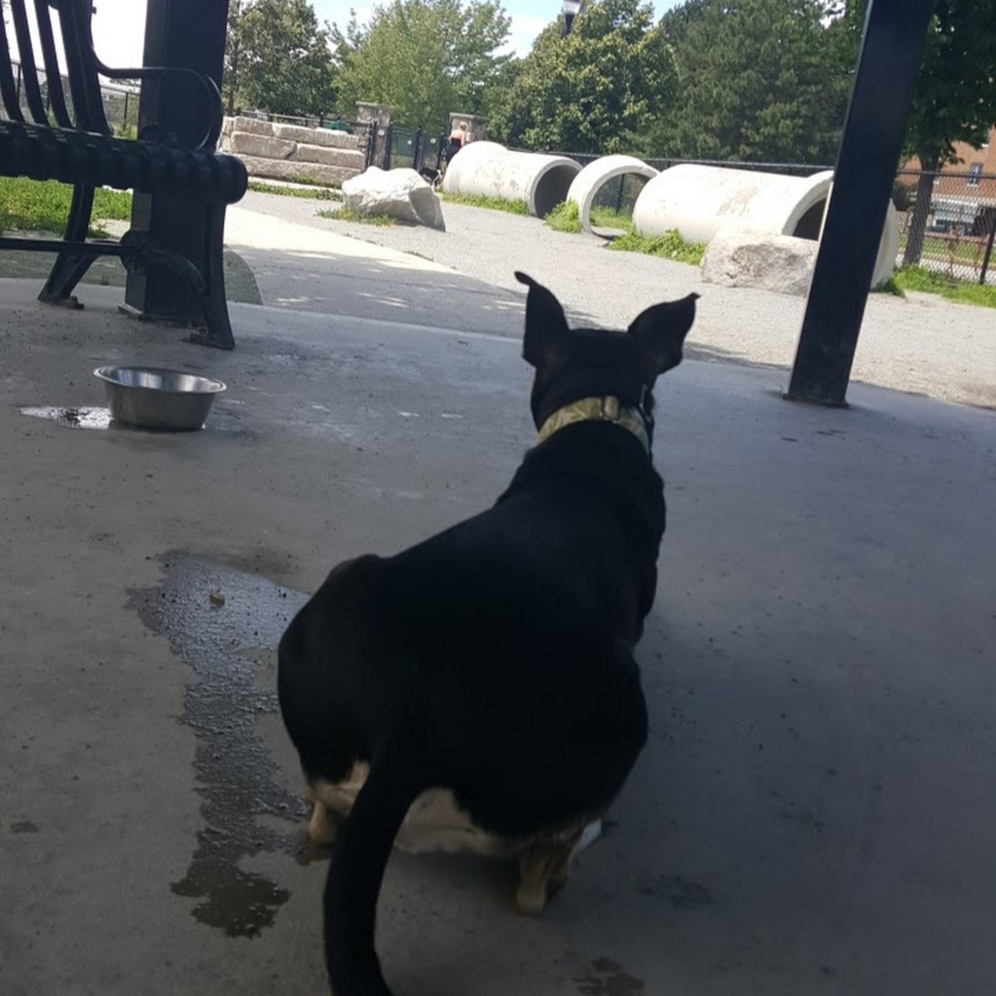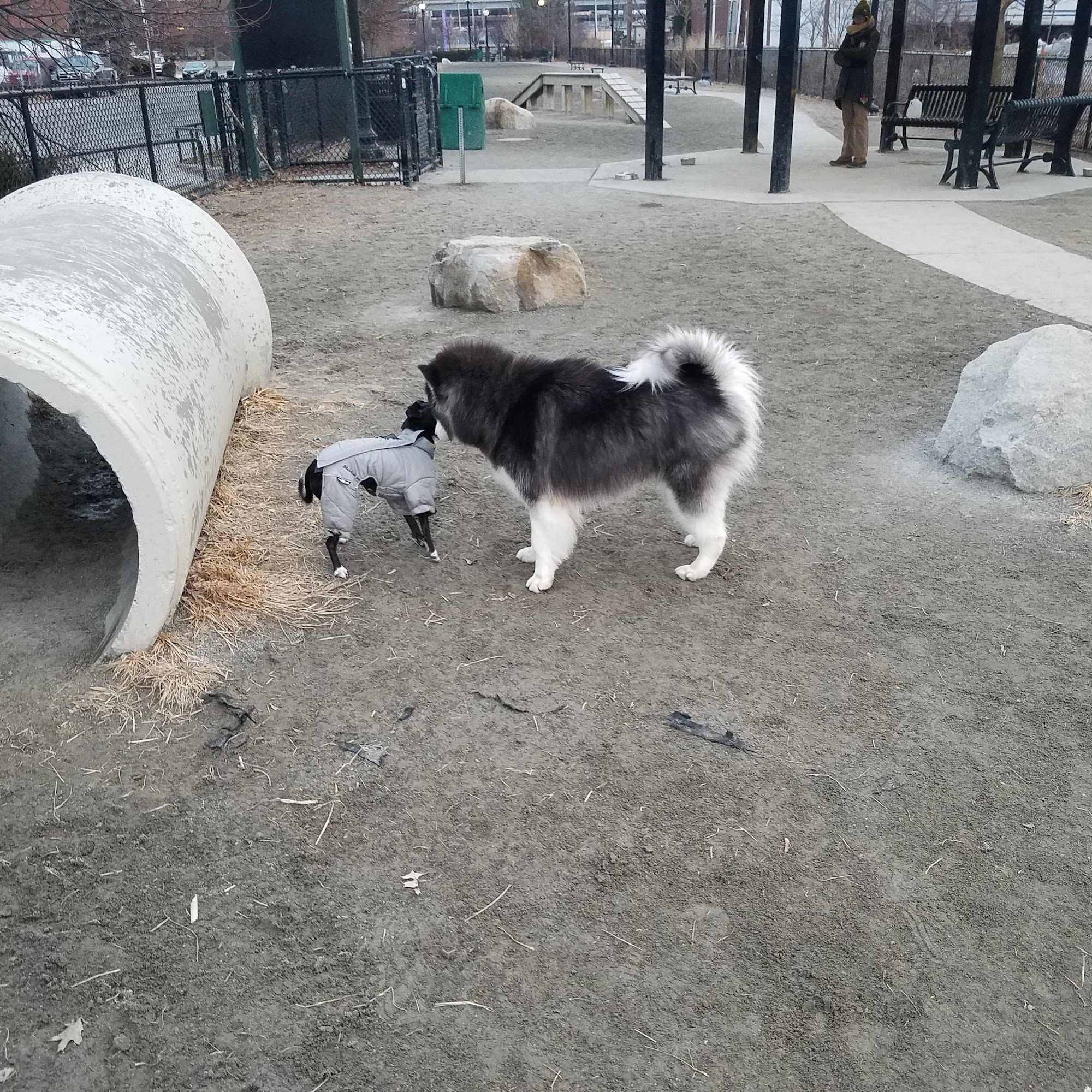 Very nice dog park in Somerville. Decent sized. Located next to the commuter rail tracks, so be aware if your pup might be scared by the passing train. People and dogs were friendly. Water fountain present, along with a spigot to fill bowls or pools.