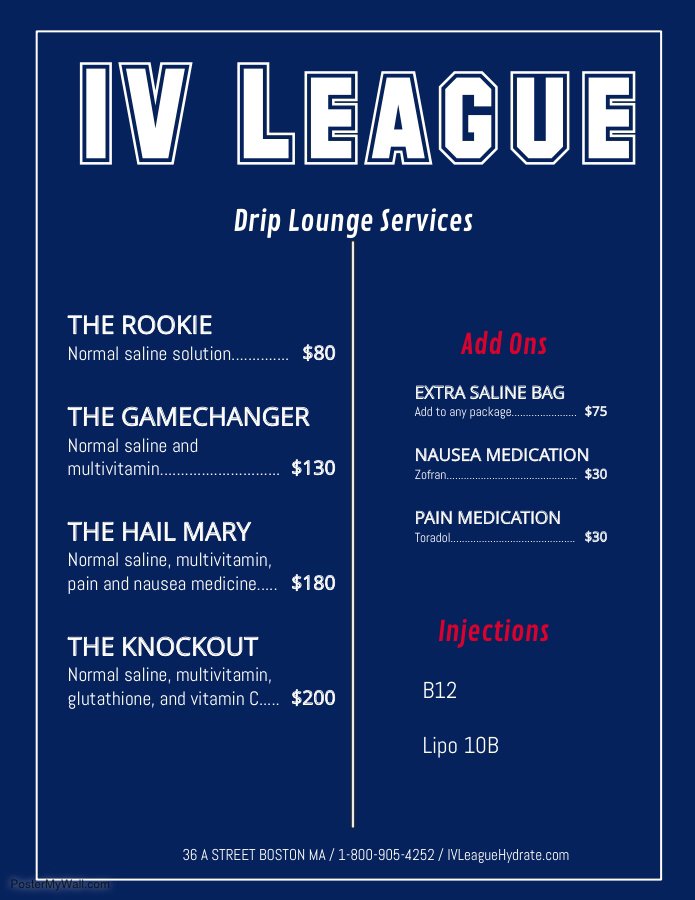 IV League is a concierge IV Hydration company serving the Boston area, offering personalized treatments that are brought directly to clients. Using a minimally-invasive procedure, IV League delivers fluids, vitamins, and nutritional supplements directly into the bloodstream to help with dehydration, hangovers, cold and flu symptoms, fatigue, and jet lag. Their proprietary blends of IV infusions are also designed to improve overall appearance by flushing out toxins and enhancing hair and skin health. Customers consistently praise the professional, friendly, and knowledgeable nurses who provide fast and effective treatments, often on the first try. Many appreciate the relaxing environment and the noticeable boost in energy and well-being after visits. Whether recovering from a hangover, illness, or simply seeking a wellness boost, clients find IV League’s treatments to be highly effective and a valuable way to feel better quickly. The company's focus on excellent customer service and tailored care makes it a trusted choice for IV hydration needs in Boston.