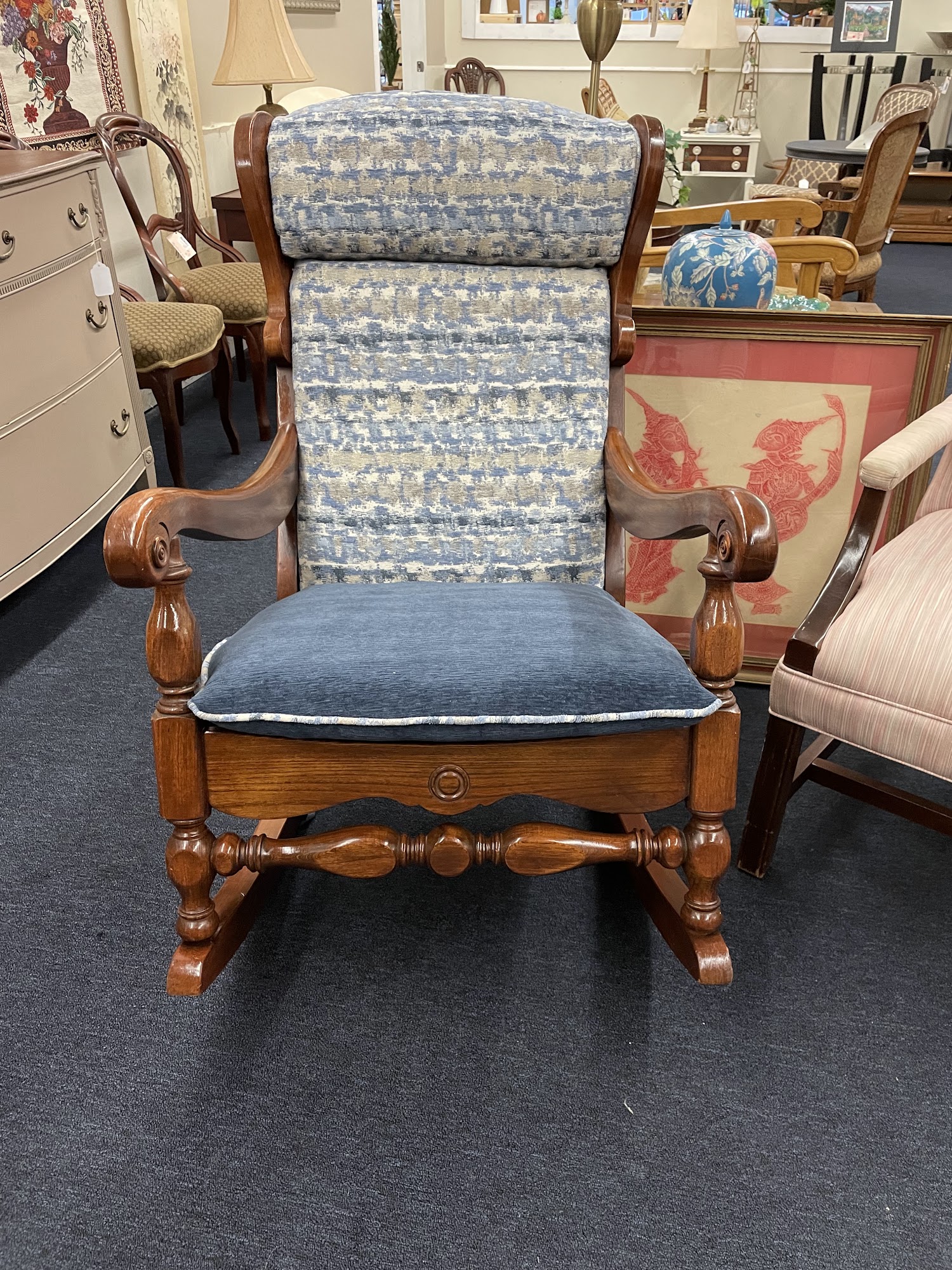 I purchased a piece that Maria reupholstered in a beautiful fabric. A wingback chair, she did an awesome job. Its a solid stylish piece and very comfortable. I loved what she did I brought a rocker for her to work on, with the same fabric. I cant wait to see it.