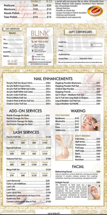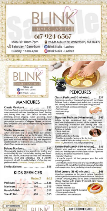 Blink Nails - Lashes offers nail beautification services for men and women. On going promotion Off 20% prices on services, 30% on Eyelashes. We offer services for hands and feet, including manicures, pedicures, nail polish application, nail repair, hand and foot treatments, wax services , facial services, and eyelash services.