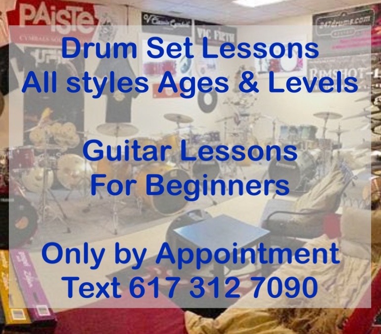 Drum Set Lessons for All Styles, Levels and Ages. Guitar Lessons for Beginners. We Also have Some Drum Gear for Sale. We Offer Repairs but ALL and ANY of our services are by Appointment Only. Text 617 312 7090 to Schedule. We also have 2 More locations in Boston. Please visit our Website