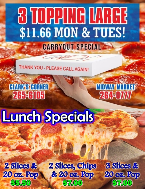 Midway Market is a convenience store offering all of your convenience store needs as well as Hometown Pizza. It provides pizza by the slice available all day, starting with famous breakfast pizza in the mornings. The lunch special offers four different kinds of pizza by the slice. The store also sells lottery, beer, wine, liquor, tobacco, chips, pop, energy drinks, sports drinks, grocery items, and automotive supplies. Reviews highlight the great and yummy food, especially the best breakfast pizza. The employees are noted as friendly and nice, providing great customer service and fair prices. Some mention that calls in the morning sometimes go unanswered.