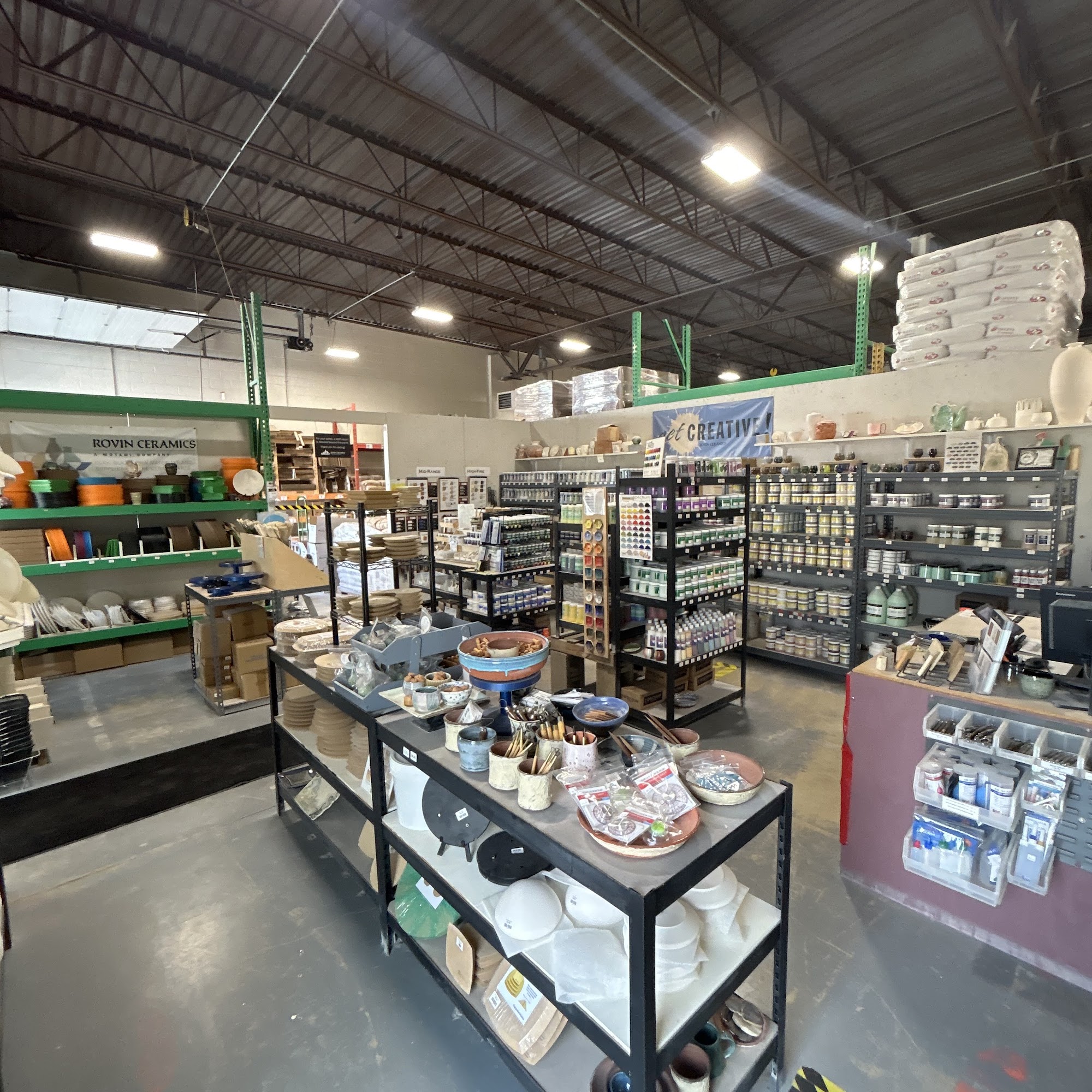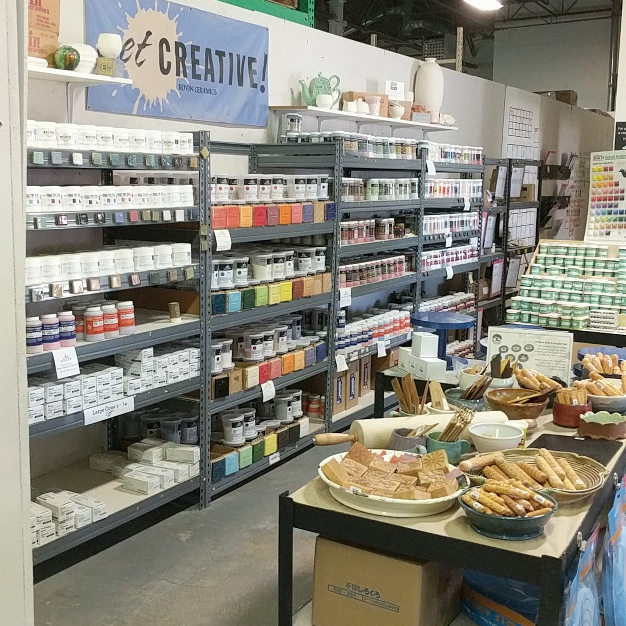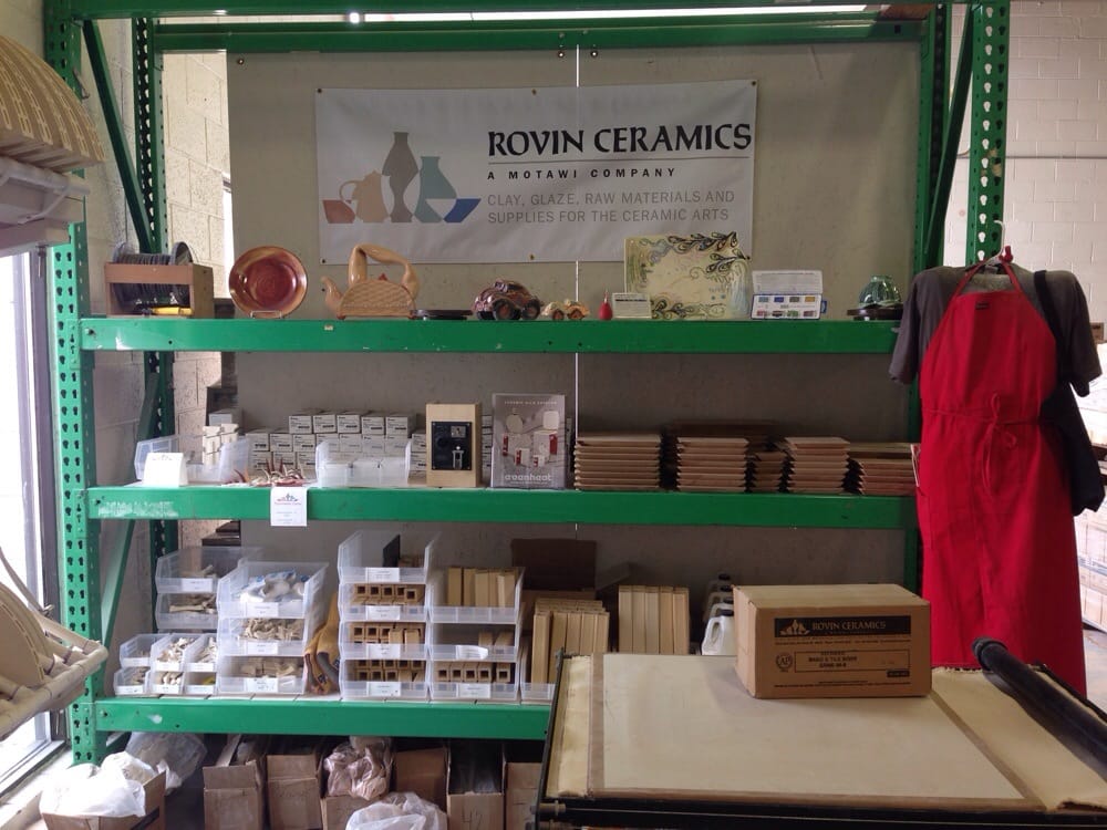Rovin Ceramics is a friendly and knowledgeable local shop for all things ceramics. They carry a wide selection, including underglazes, glazes, clay, spodumene, frits, tools, and drape molds. They are affiliated with Motawi Tile. Their products are well-priced, with very reasonable prices on tools and great prices on materials. The staff is super friendly, patient, helpful, and knowledgeable about their products. The shop has a small retail space but offers almost anything you might need. They provide helpful details, like fired example pieces for their many stunning glaze and underglaze options. Their "You Betcha" mid-range clay mix has a bit of grog, giving it more structure and heft, which is good for sculpting and holding shape. They sell underglazes in various sizes, from 2oz bottles to pints, suitable for both hobbyists and those needing more. They also offer fast and well-packaged shipping for orders. While they can occasionally be out of a few items, customers find it a great place overall and highly recommend it, planning to return and order again.