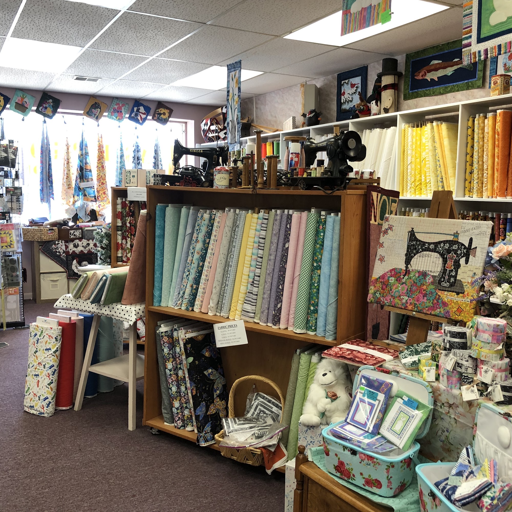 Nice selection of fabrics, notions, embroidery threads, knitting needles, wide backs, longarm service and pattern packs. Thank you Jamie and Tonya for your service. Off to make a quilt!