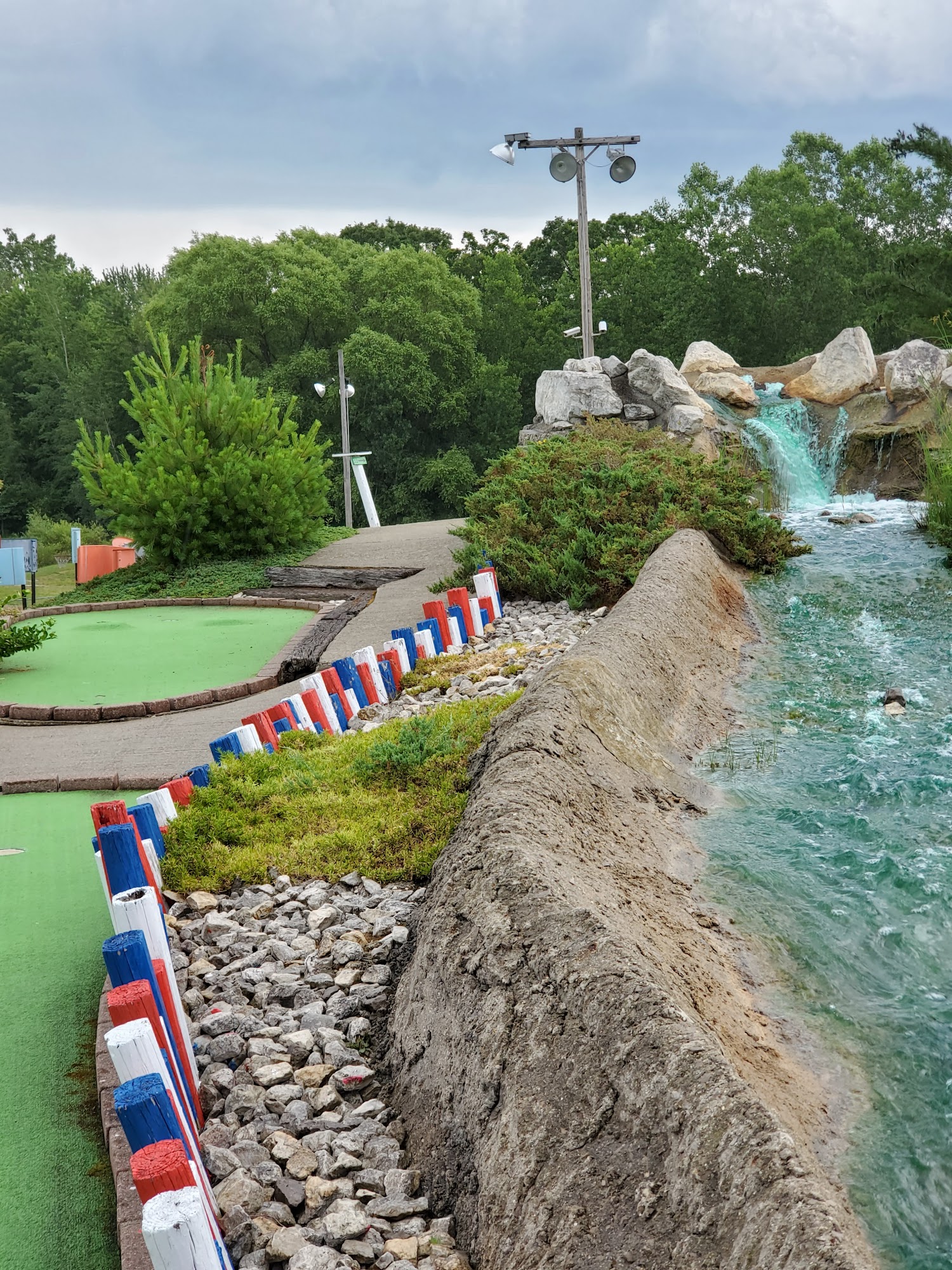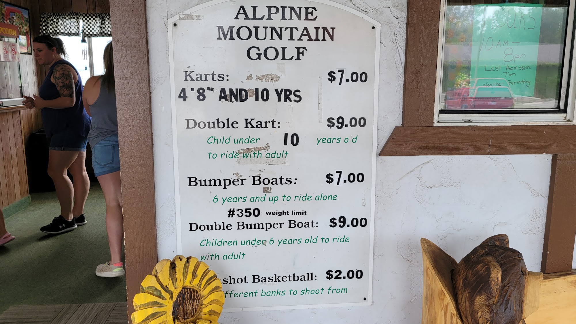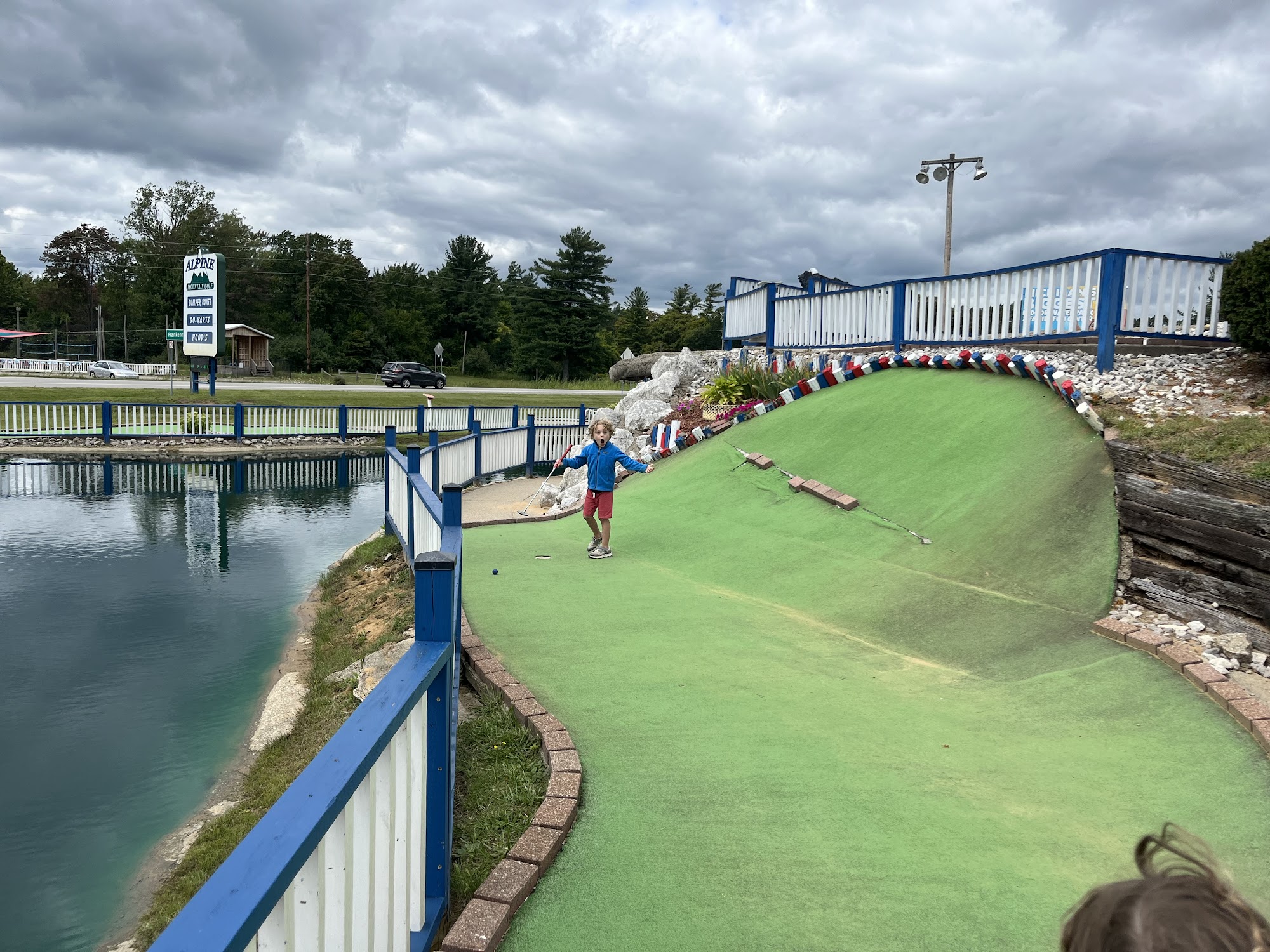 Alpine Mountain Golf offers family fun with two miniature golf courses, go-karts, and bumper boats. The Amateur course goes under a waterfall and on top of a mountain with hills and curves. The Skill course is around the base of the mountain with rock obstacles, providing some challenging holes. Go-karts are noted as so much fun, with double karts available. Bumper boats are also offered with double boats. The attractions are fun and in working order, allowing guests to zip through quickly. Some visitors found the Skill course holes challenging but mostly boring, just green and rocks, while the Amateur course looked more exciting. Opinions on staff varied, with some finding them top notch and the nicest people, while others found them a little rude or unhappy. Some feel the price per activity is a little high. The experience is described as decent, not fancy but great for a casual game, with nothing to be disappointed or thrilled about. It is a place for general family fun. Hours are daily from 10 am to 8 pm, weather permitting.