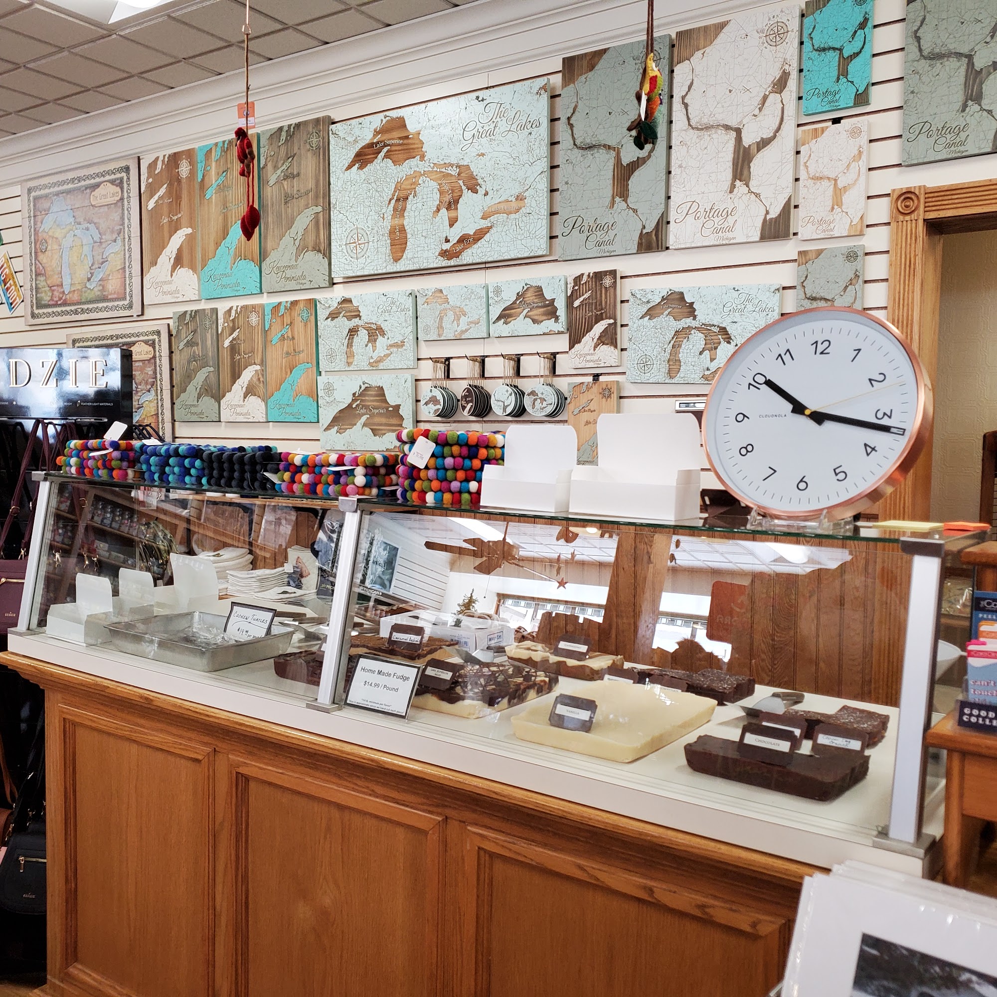 Spawling store offering everything your tourist heart desires - freshly made fudge, taffy, games, jewelry, puzzles, cards, clothing, etc.,