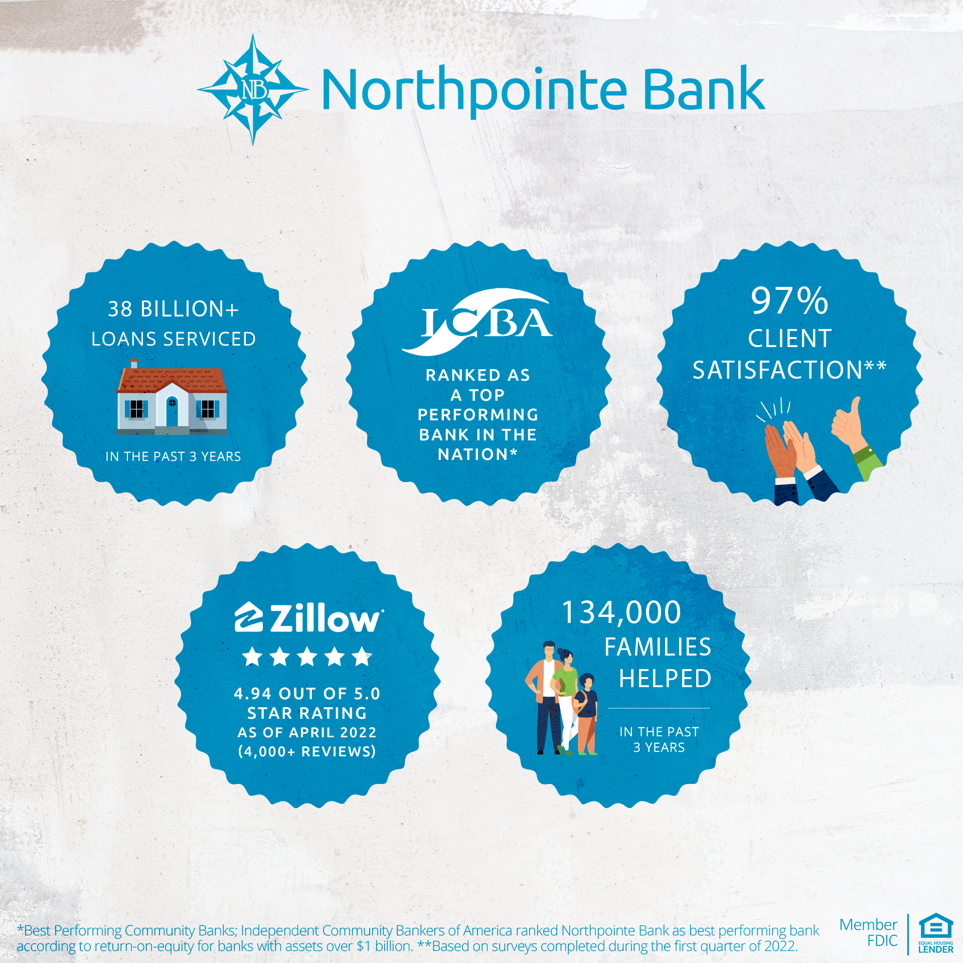 Northpointe Bank, headquartered in Grand Rapids, Michigan, is a client-focused company that provides home loans and retail banking products to communities across the nation. Our mission is to be the best bank in America by bringing value and innovation to the people we serve. For each of the past nine years, Independent Community Bankers of America® has ranked Northpointe Bank as a top-performing bank in the nation out of approximately 5,000 ICBA member banks.