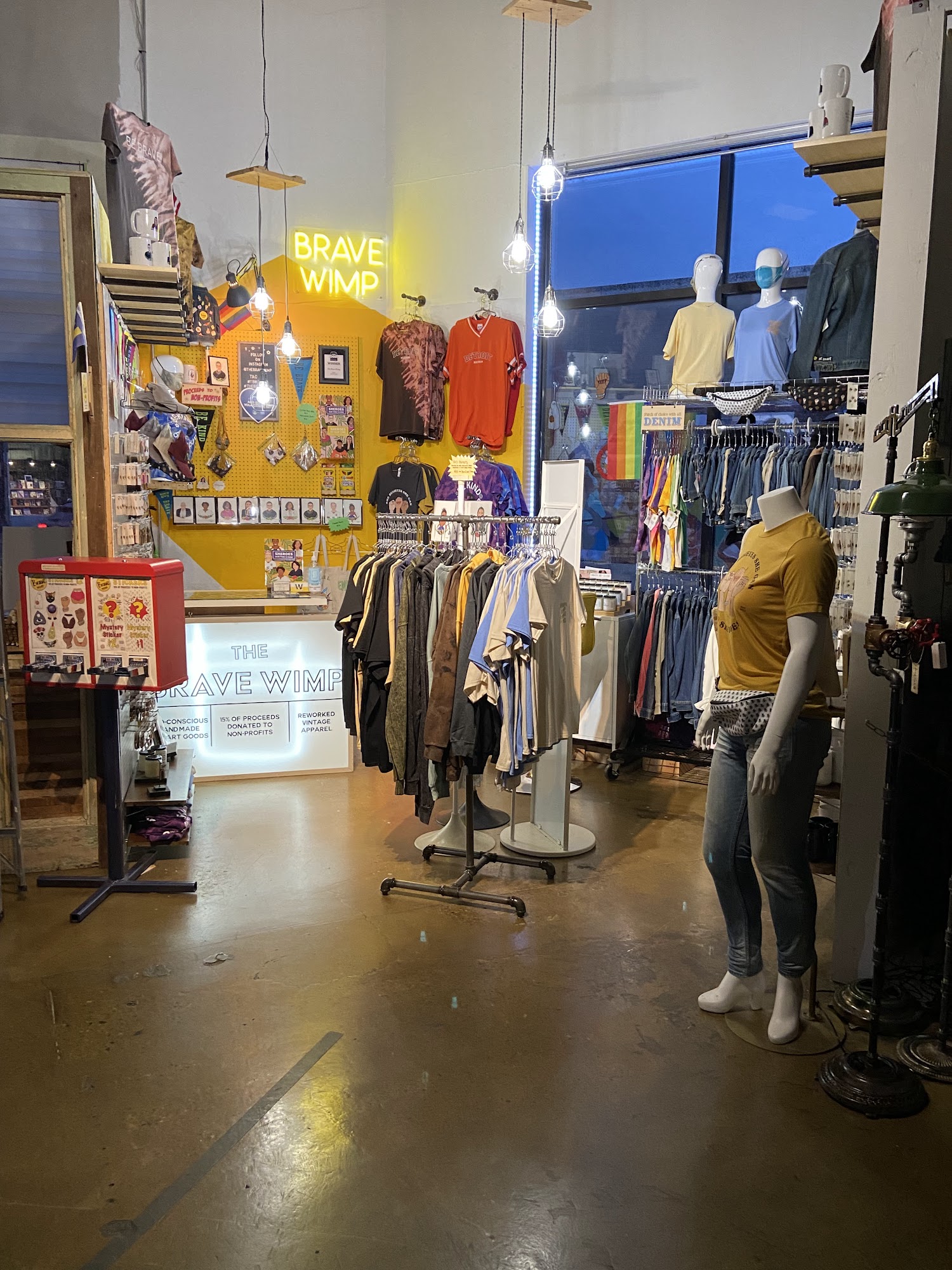 The Brave Wimp is a popular and unique shop located at Rust Belt and in downtown Detroit, known for its affordable and eco-conscious wearable Pop Art. The store offers a wide range of high-quality products, including lapel pins, jewelry, homewares, apparel, stickers, candles, mugs, and cards. Many items feature feminist themes, social issues, and inclusive messages, appealing to those who want to celebrate pride, feminism, or support social change. The shop is praised for its fun, well-made items and its friendly, welcoming vibe. It is especially appreciated by customers seeking gifts for friends or family members who identify as binary, transgender, or nonbinary. The Brave Wimp also donates 15% of its proceeds to local and national nonprofits, emphasizing its commitment to social causes. Visitors often find the shop to be a great place to discover unique, trend-aware products that make meaningful gifts or personal treats. Overall, The Brave Wimp is a favorite destination for those looking for fun, inclusive, and socially conscious items.