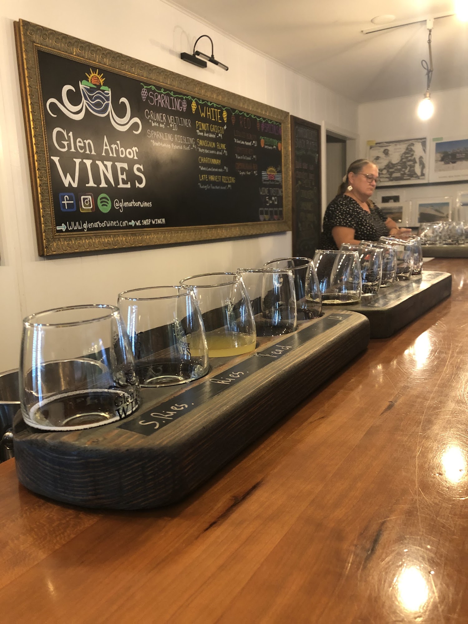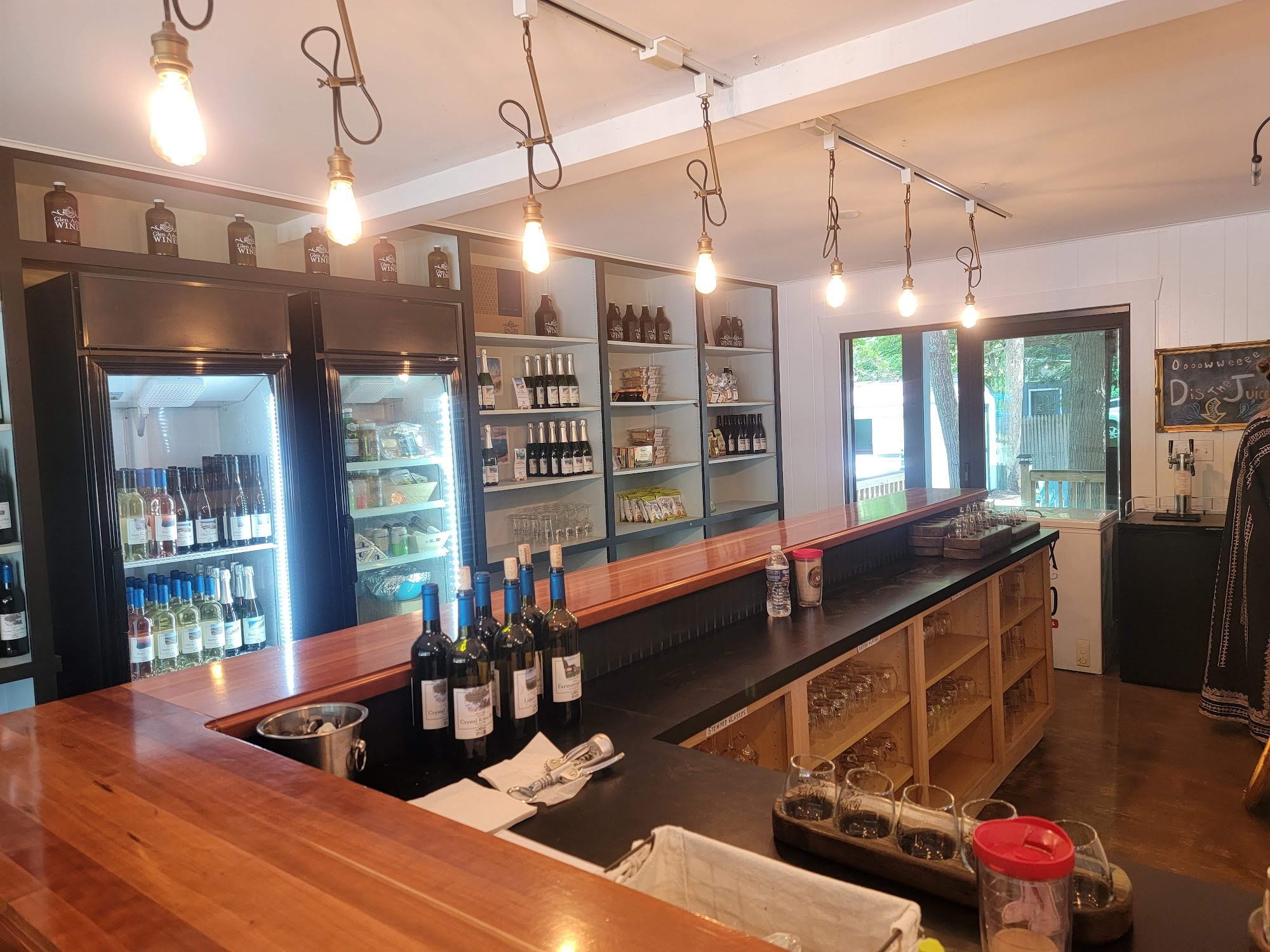 Glen Arbor Wines is a welcoming wine and art lounge located in the heart of Sleeping Bear. Visitors can enjoy lively conversations at the bar, relax on spacious grounds around firepits, or listen to live music on Tuesday nights featuring Luke Woltanski. The venue offers yard games, local cheeses, snacks, and the option to bring in outside food, while a gallery showcases works by local artists. The wine selection is impressive, with reds, whites, and bubbles of top quality, including favorites like the crisp GrĂ¼ner and highly praised Chardonnay. Tastings are highly recommended, and the friendly, knowledgeable owners create a warm atmosphere that feels like family. Outdoor seating around firepits adds to the cozy vibe, making it a perfect spot for an evening outing. The staff is friendly and accommodating, often going above and beyond to ensure a great experience, and the space is clean, stylish, and inviting. Visitors appreciate the welcoming environment, good wine, and the chance to enjoy yard games or sit with the resident dogs. Many highlight memorable moments, such as delightful tastings, friendly service, and the kindness of the owners and locals. Overall, Glen Arbor Wines offers a delightful blend of wine, art, music, and community in a relaxed and charming setting.