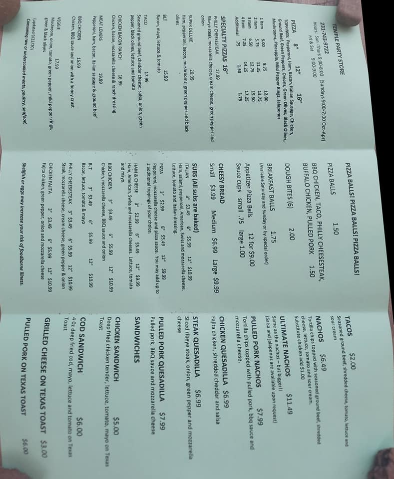 Temple Party Store is a very nice store with anything from food to any camping supply one could think of. It is famously known for its pizza balls, which are absolutely delicious and buttery, tasting like a bread stick and pizza wrapped into one. Popular options include pepperoni, Philly cheese steak, Buffalo chicken, and pulled pork. These pizza balls stand alone and need no dipping sauces. The store also carries alcohol, tobacco, and unique items like banana moonshine. It is definitely worth a drive, even just for the pizza balls.
