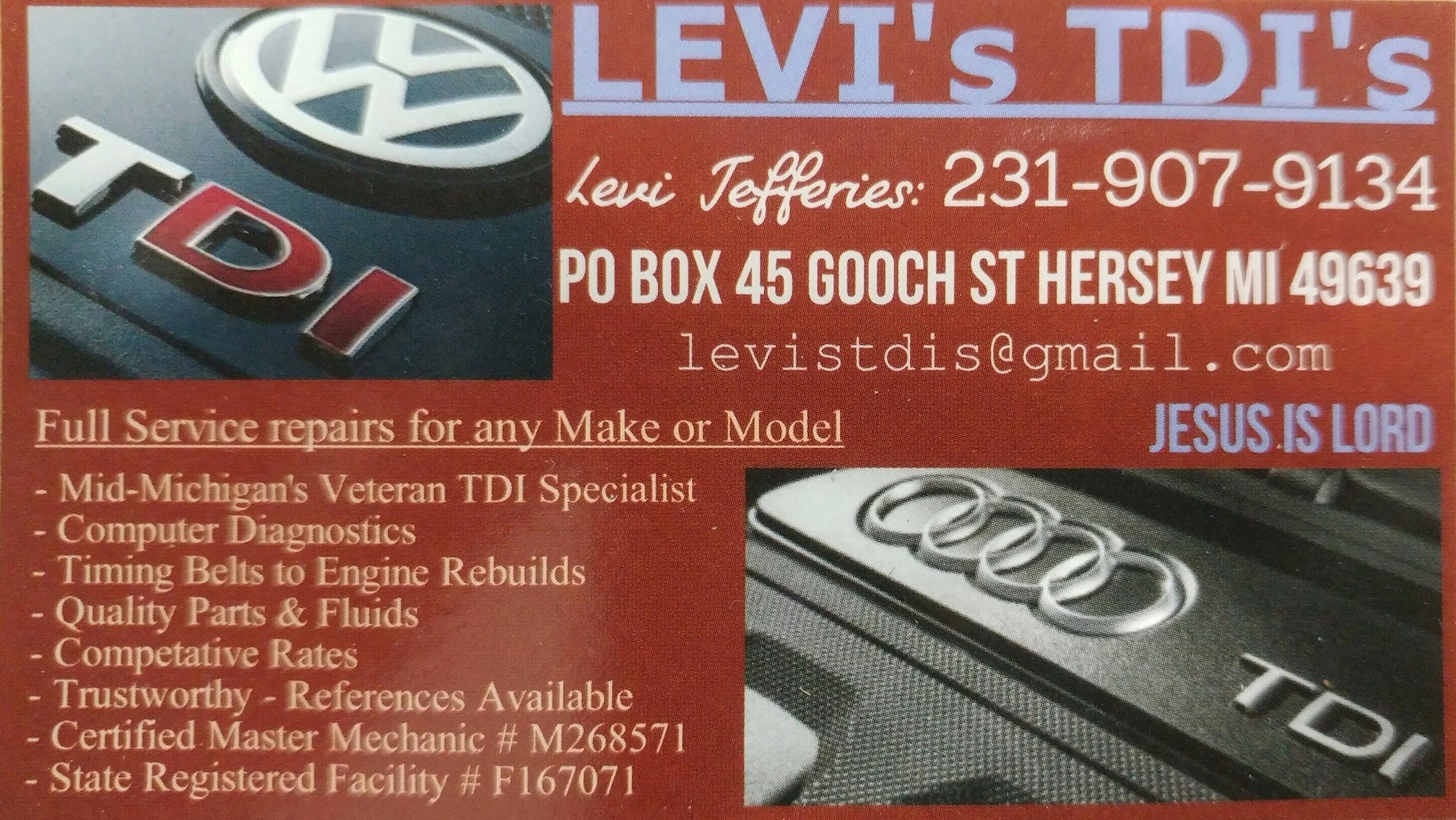 Levi's TDI's is an honest and trustworthy shop with a kind and knowledgeable team. They do great quality work at excellent prices. The staff is friendly, helpful, and are good people. They are very busy, so rush jobs are not available. Customers trust them with services including transmission work and oil changes, and many recommend the shop to friends and family.