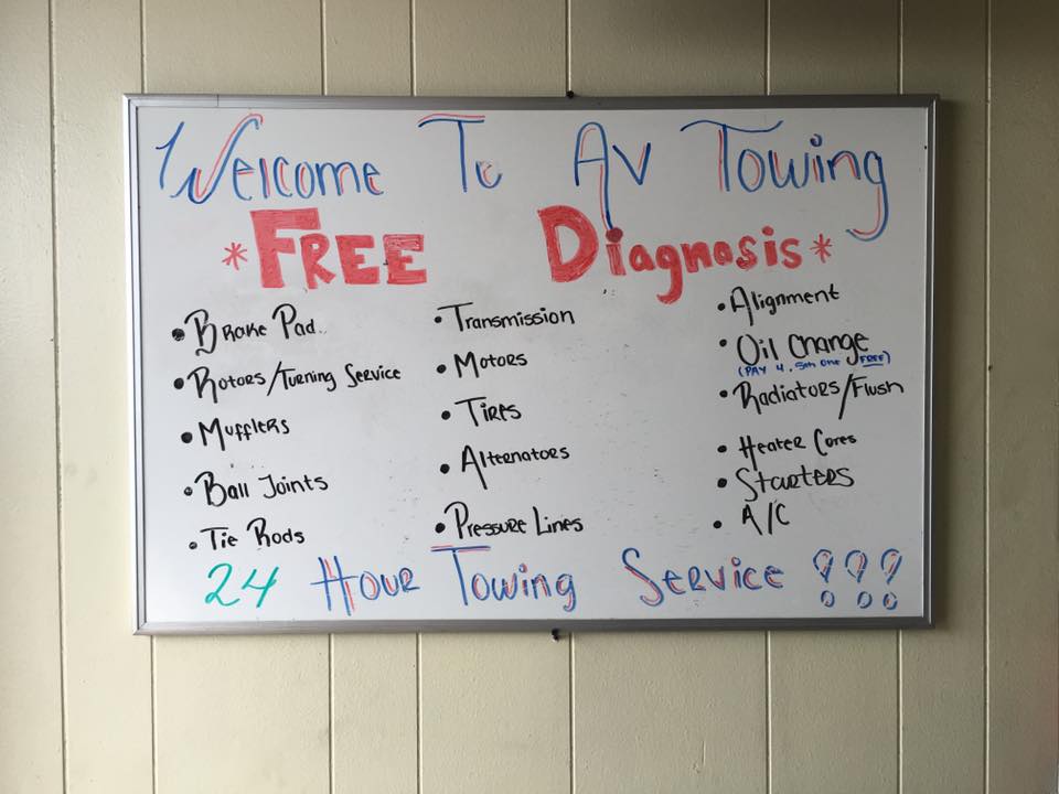 AV Towing Services is an awesome family business known for excellent customer service and great work. Customers are greeted with a smile and find the staff very friendly, cordial, and cheery. The service is always fast and reliable. They offer the best prices in town, with very reasonable and fair prices for tires, brakes, and other work. Many customers trust them with their vehicles, recommend them to others, and continue to support this local business.