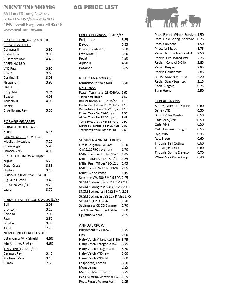 Next to Mom's is a Farm to Table Beef, Lamb and Pork supplier. A subsidiary of Edwards Farms, Matt and Tammy Edwards are proud to supply quality locally raised meat to the community. Our meat is all born and raised on our farm North of Ionia Michigan. You will taste the difference! All meat is USDA packaged. Next to Mom's is also a full-service seed supplier. We can supply seed for virtually any need. Corn, Soybeans, Alfalfa, Clover, cover crops, food plots and more! Next to Mom's is also happy to offer Wool Bedding from the wool sheared from our sheep and processed at Zeilinger Wool Co.