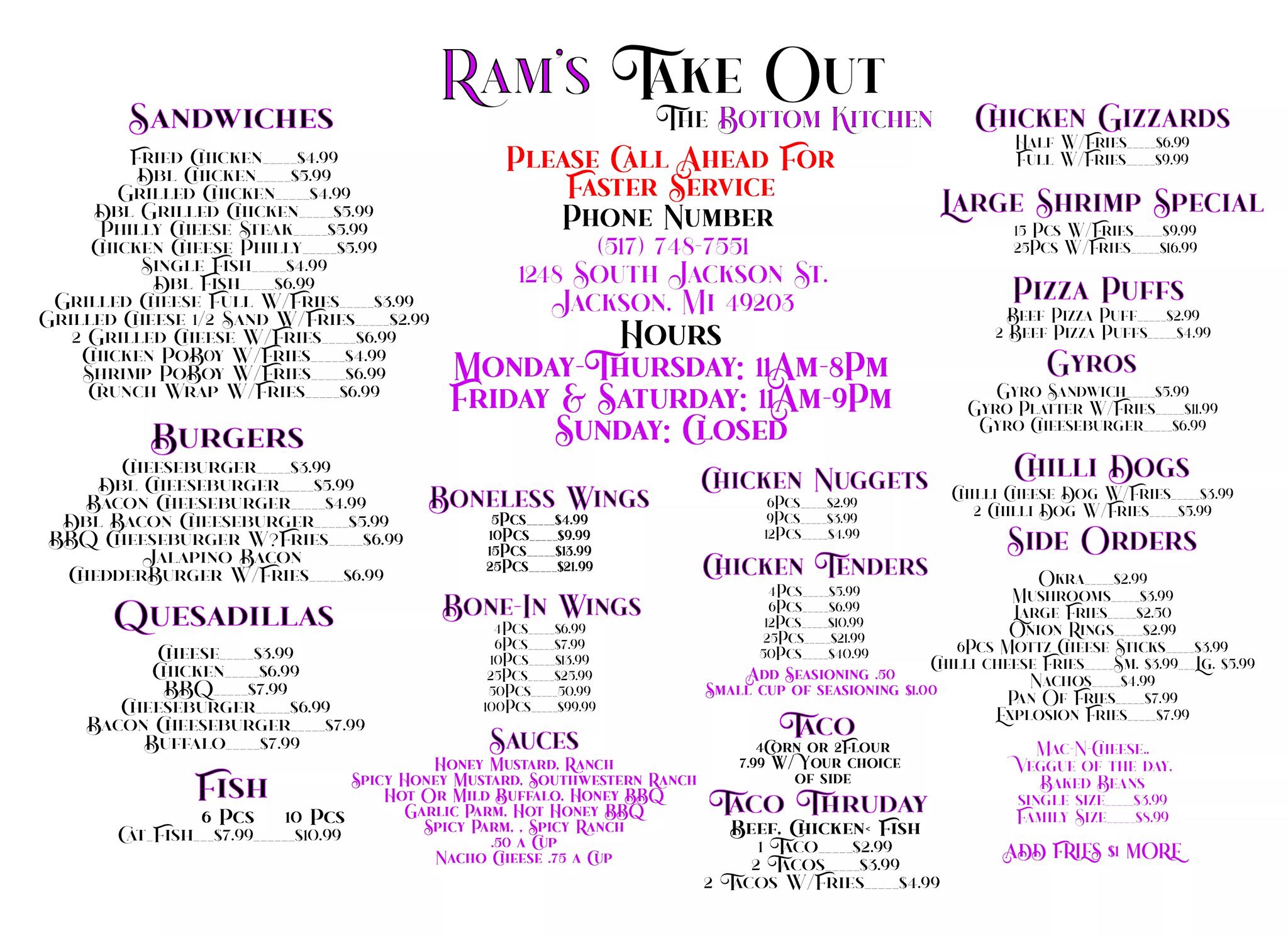 Rams take out, Michigan Center MI 49254 Tips