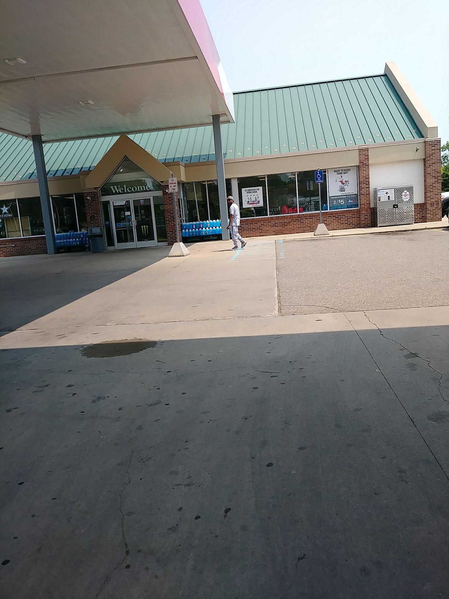 Friendly and efficient. Staff were emptying trash inside and outside at all receptacles. Also making sure the grounds were clean and walkways swept and outside bag ice was ready for purchase. Working hard to make establishment safe,clean and welcoming.