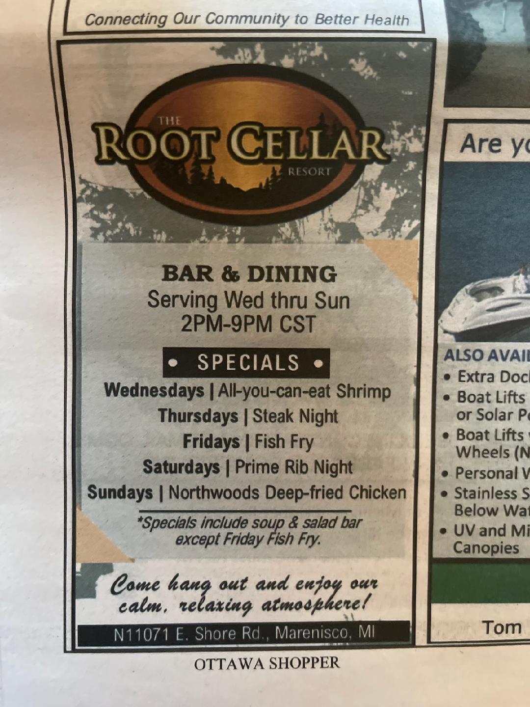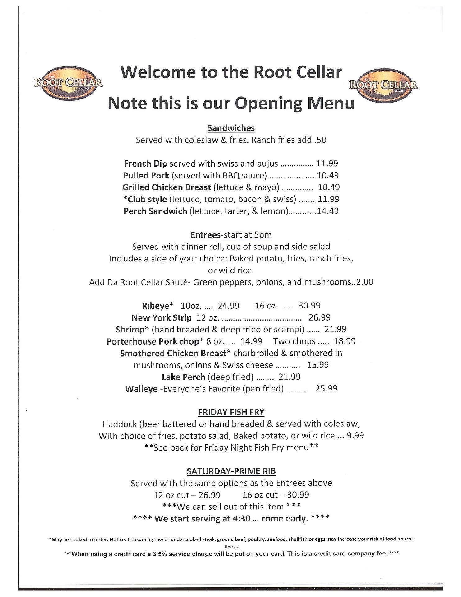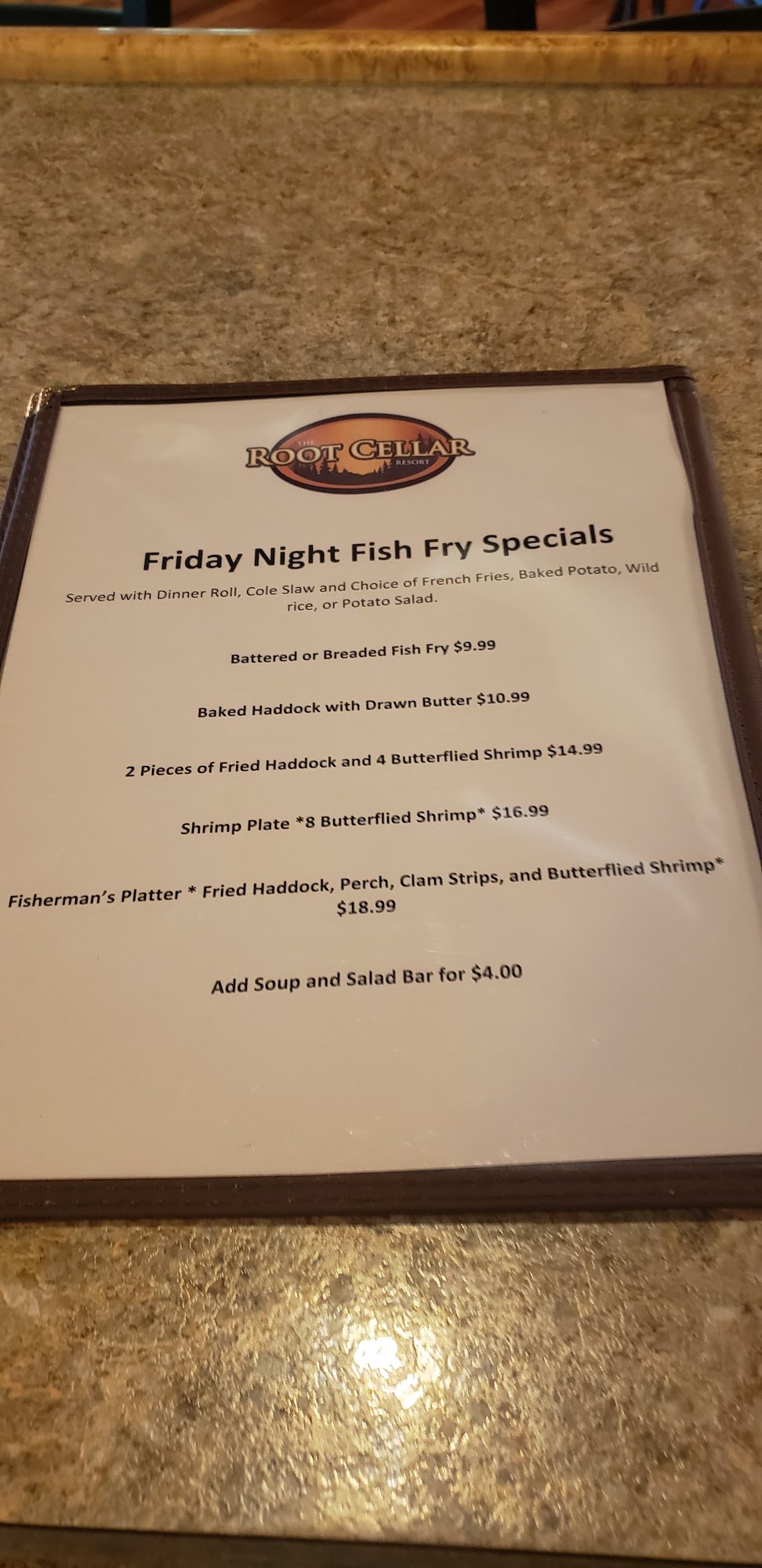 Root Cellar Resort and Dining is a reliable place for a good meal, often described as incredible and fantastic. Under new ownership, the menu remains the same with great additions like a new concrete patio for outdoor seating. The food is excellent and cooked to perfection, with highlights including the Saturday Prime Rib with generous cuts, rib eye, pulled pork sandwich, mushroom swiss burger, club sandwich, Friday fish fry, and cheese curds. The salad bar is highly recommended for its freshest fixings and good ranch dressing. Sides like well-seasoned fries are also praised. Service is amazing, attentive, and fantastic, with staff noted as super friendly and making guests feel very welcome and at home. The bar service is outstanding. The location on the lake is convenient, though more boat parking is a recommended improvement. The overall experience is superb and well worth the cost, with many guests stating they will definitely return and cannot say enough good things.