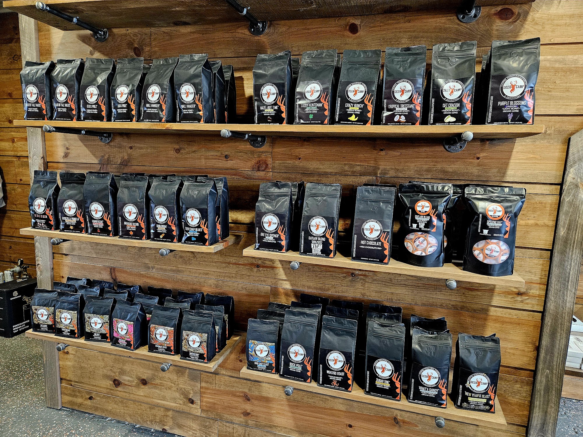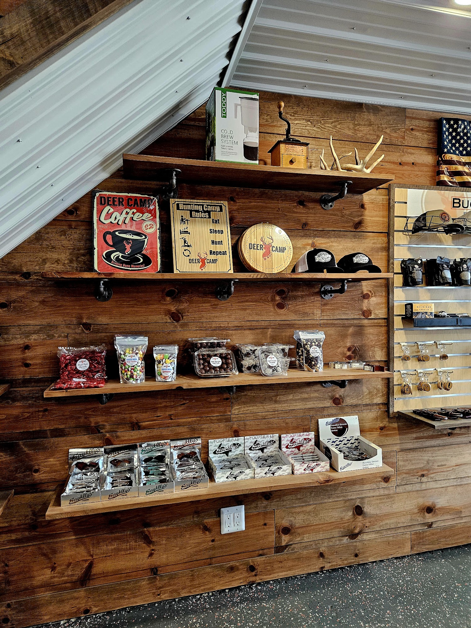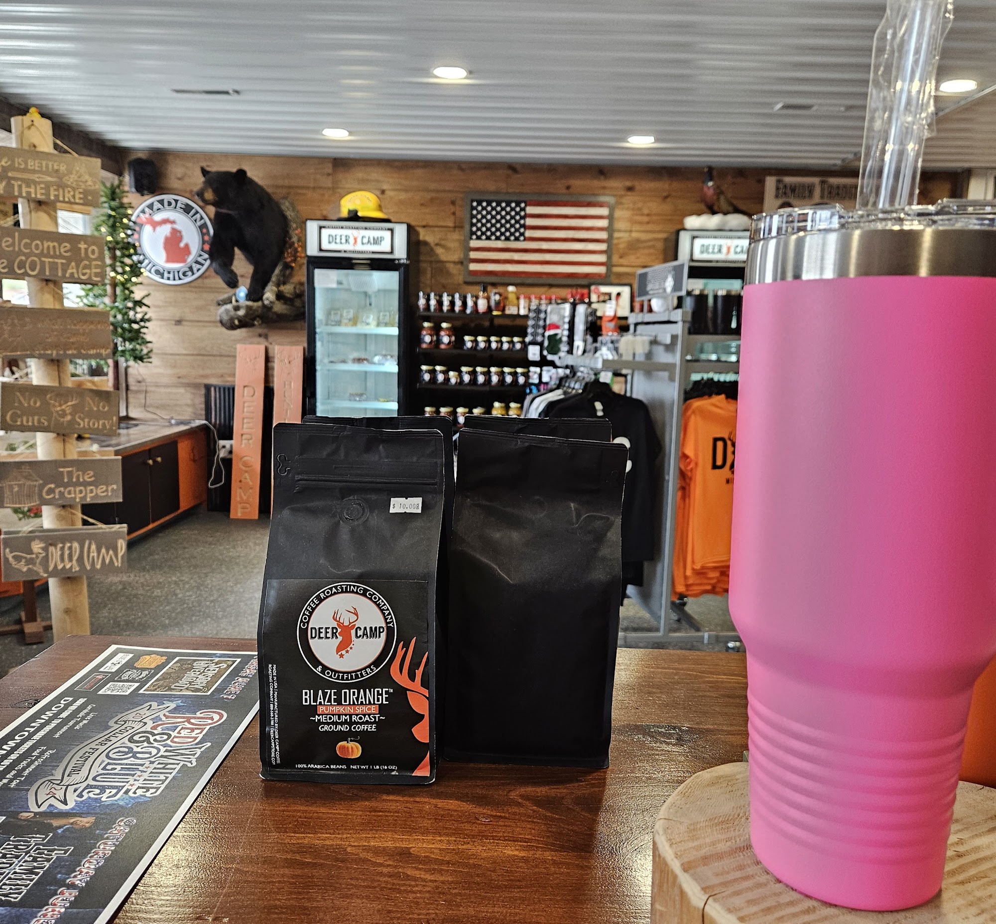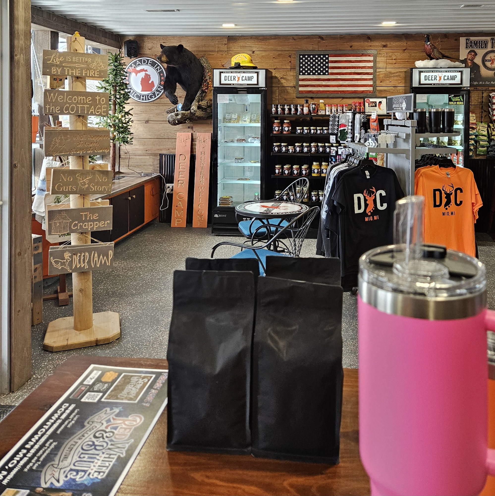 DeerCampMio is a great little coffee shop and ultimate destination for premium coffee, awesome coffee selections, and hearty sustenance like muffins, bagels, and cured meats. It offers a great supply of cool knives, hunting gear, and specialty items from the U.P., including Trennary toast. The coffee is delicious, very good, and the best in town, with phenomenal lavender lemonade and many lemonade flavor options. The owners are super friendly guys, as good as they come, with great service. It is an outstanding place and a great spot for a good cup of coffee and more, deserving the hype.