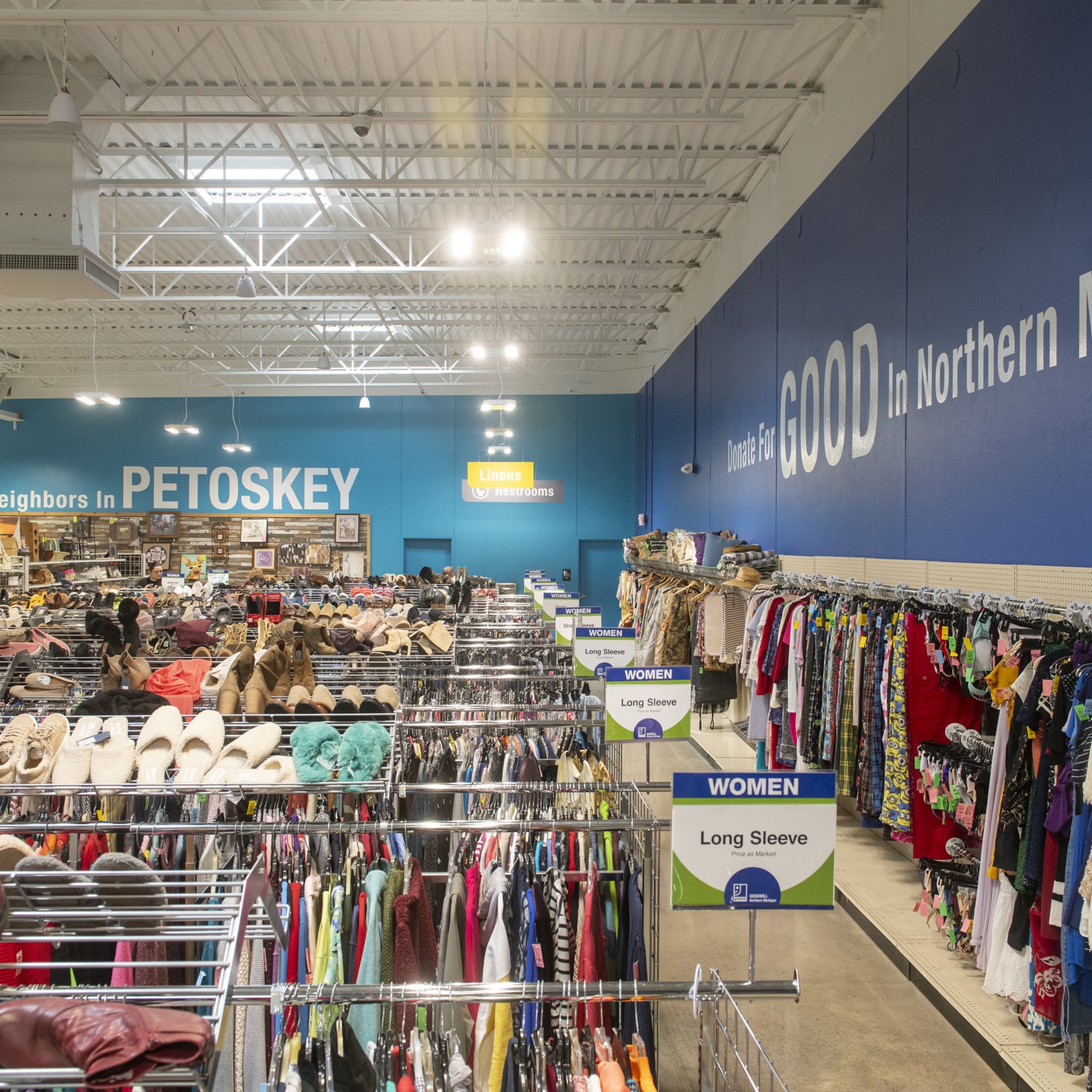 Goodwill Northern Michigan in Petoskey has moved to a new, nicer location that is well-organized with eye-friendly lighting, making it easier to shop. The store features a distinctive cosmic bowling-style checkout counter. Shoppers report a clean environment and a fantastic, helpful staff. The pricing includes many items at $5.99, allowing customers to gather more good finds. The store layout is praised for having separate Big and Tall and Plus Size sections, which simplifies shopping. It also carries specific items like men's diabetic socks in good stock. However, some customers express disappointment with certain aspects. The store no longer carries glassware and large bowls like it used to, focusing mostly on clothing. Some items, including white clothing and a dress, have been found on the floor with stains, leading to suggestions for markdowns on damaged goods. The fitting rooms have sometimes been closed, causing uncertainty for shoppers. Additionally, the donation policy has become more restrictive with many new rules, including refusing items like an American flag, which has prompted some donors to go elsewhere. Despite these points, many visitors look forward to returning and hope to see continued positive changes.