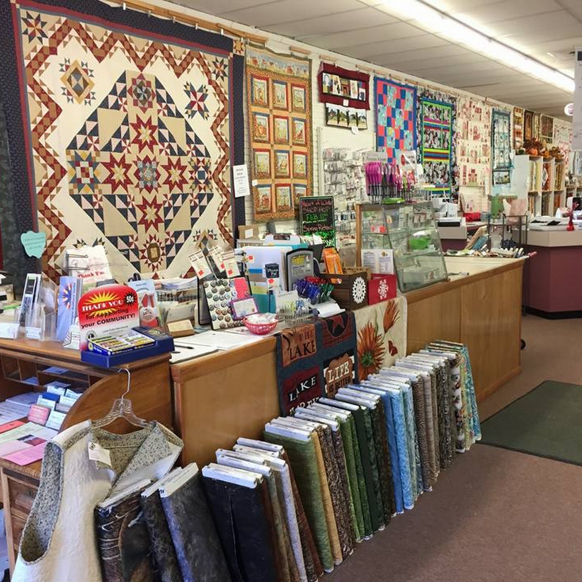Large selection of counted cross stitch patterns. Did not notice many kits. Some cute quilt fabric.