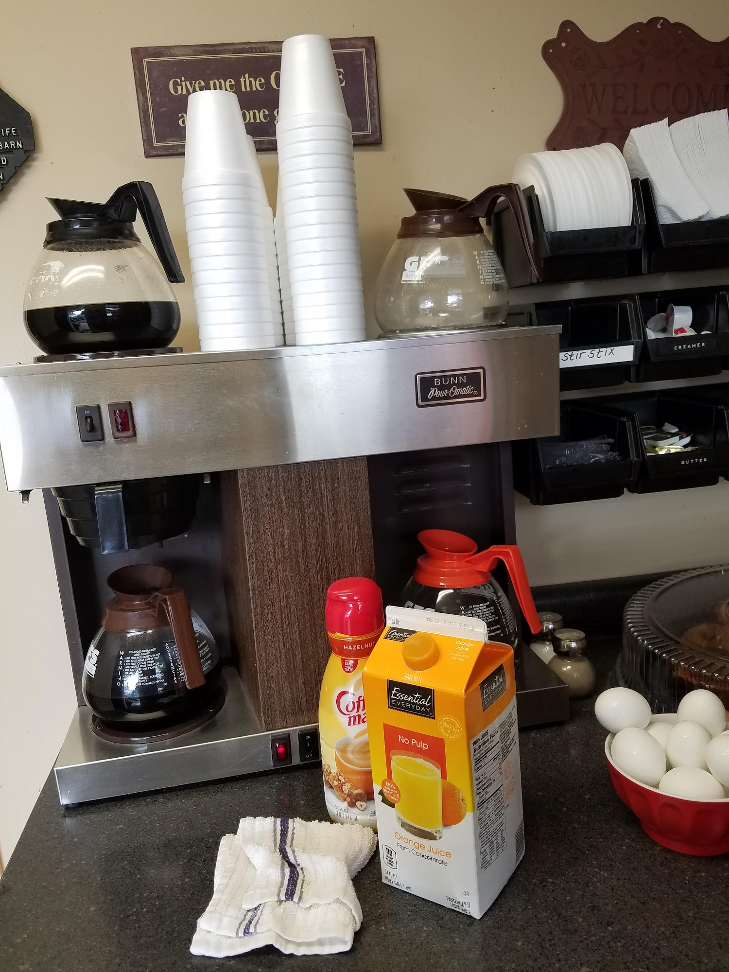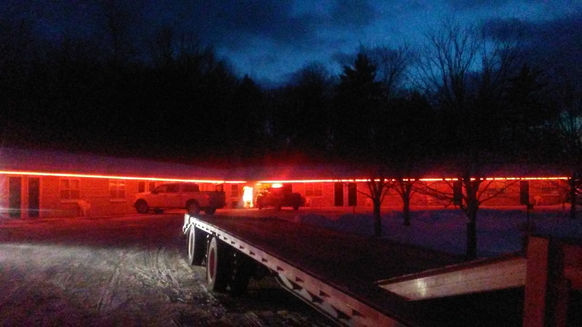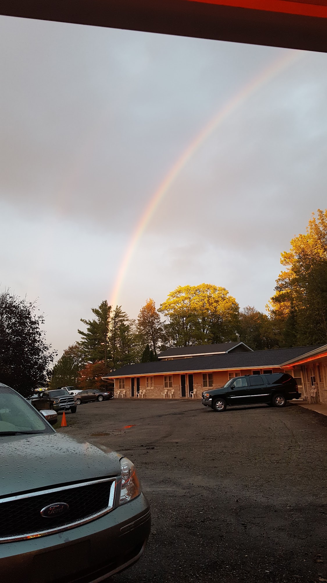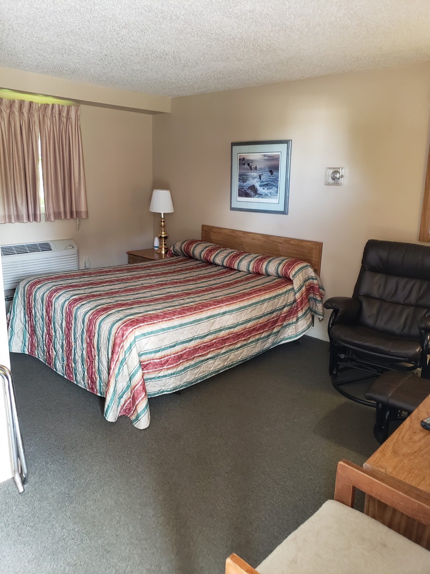 The rooms were clean. We had a refrigerator and microwave in our room. We came in the evening. Our pet was welcome. Complimentary breakfast in the morning.
