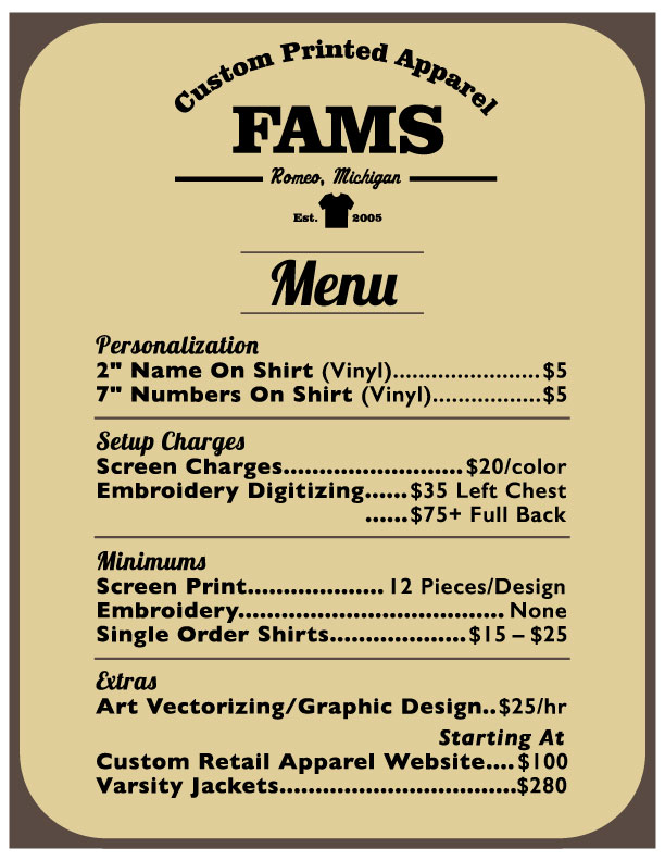I am a small business owner, FAMS printing has done nothing but help scale my business. Zach has worked one on one with providing me the correct shirts, polos, and flyers for my business all with my logo printed or sewn perfectly. Would highly recommend!