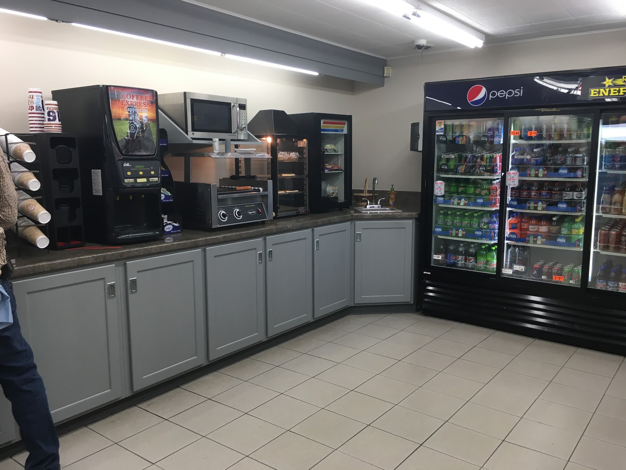 Updated since I was in there many years back. Nice clean batbroom and super friendly. You can grab something to munch on and a drink when you stop in to get gas. Very convenient location.