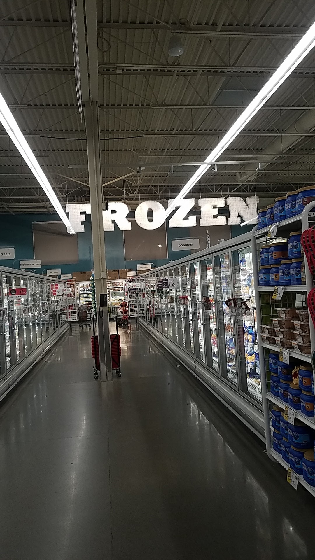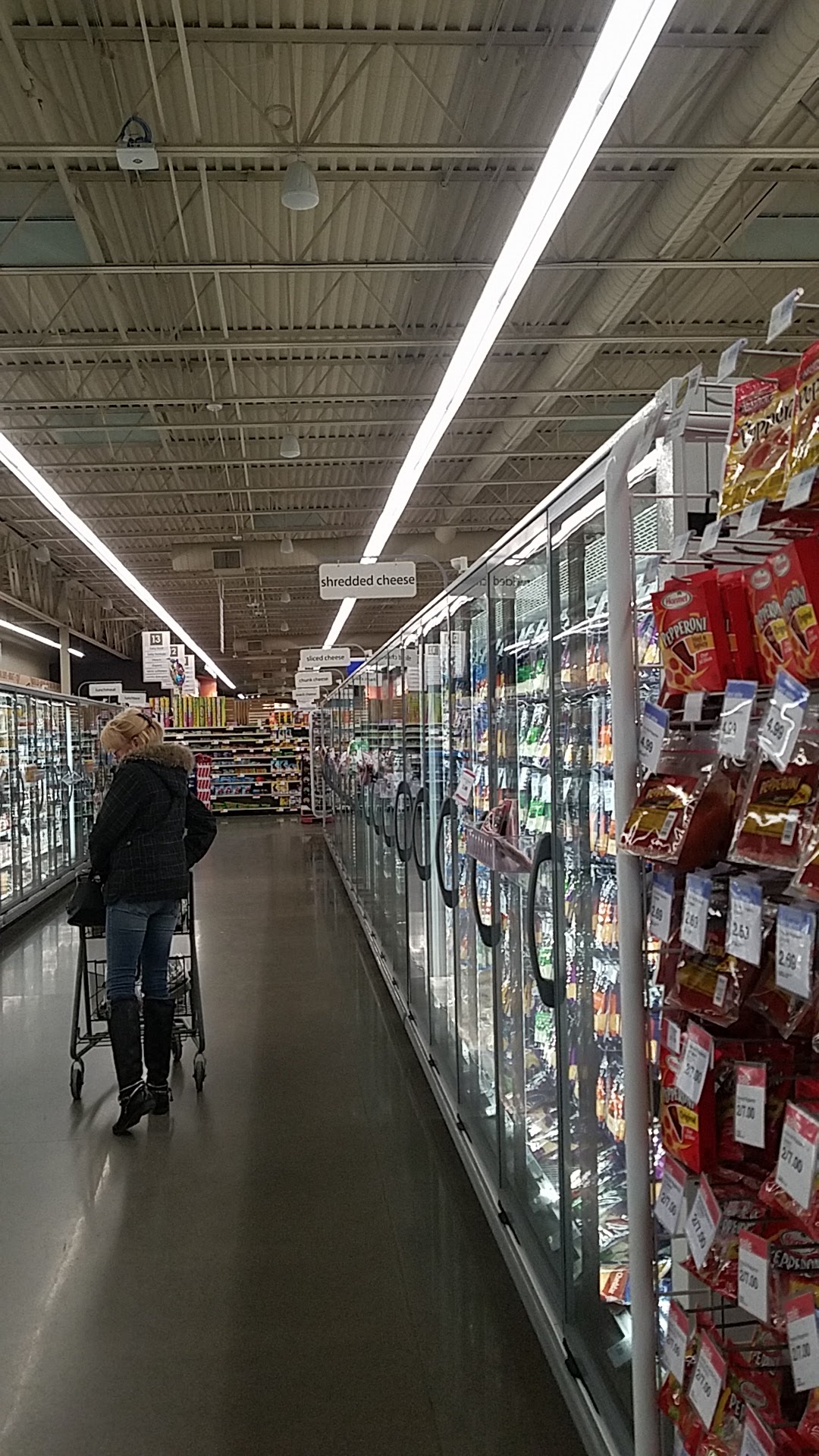 Tons of different types of foods helpful and quick checkout easy signs to read and different qualities nice workers