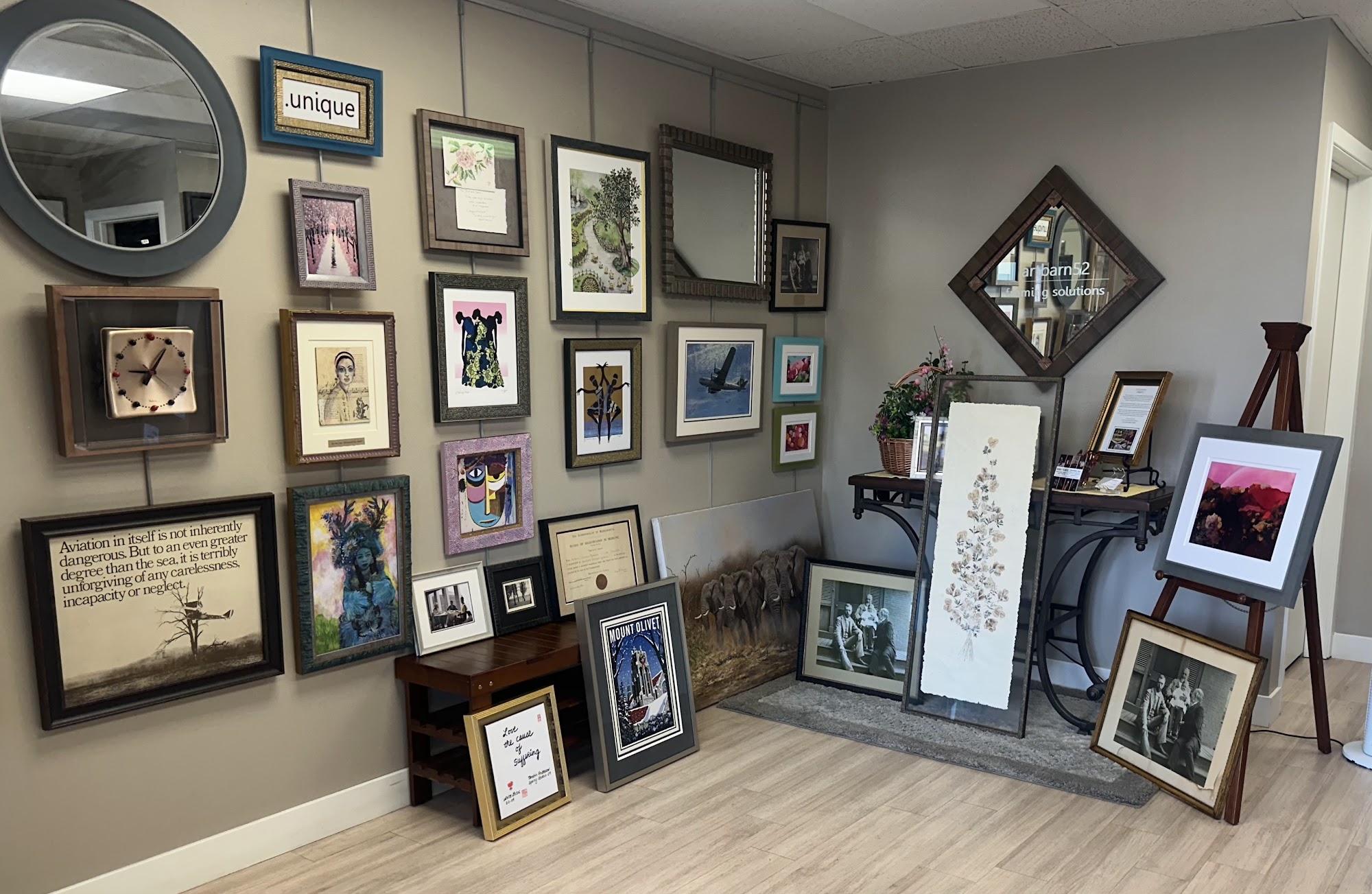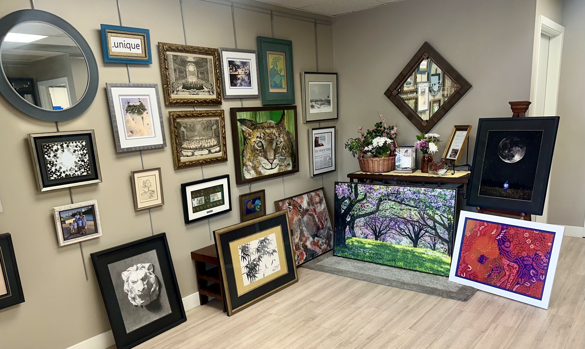 Voted as Best Custom Frame Shop - 2023, 2024 & 2025! Framing Solutions, celebrating its 10th anniversary, specializes in unique, innovative and unconventional framing designs as we believe your walls reflect your personality and interests. At this woman owned small business, you’ll experience a fun and collaborative design process. With 25+ years in the framing industry, we handle all art media, sizes, 3-D, or quantities for both residential and commercial projects. All projects are completed on site. Services include conservation cleaning, painting restoration, and digital photo restoration. We also have private installers who will pickup, deliver and install for you. Schedule your design appointment on the link here or on our website.