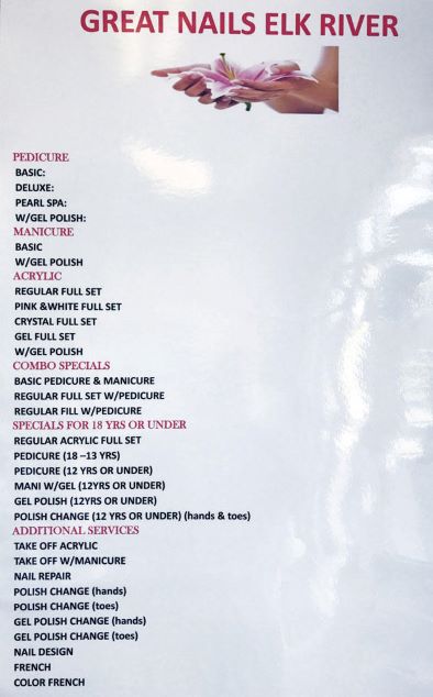 Located in Elk River, Minnesota, Great Nails Elk River offers quality comprehensive nail care services. Our technicians are well trained, and have countless years of experience to provide you with unmatched service. Our salon and nail specialists specialize in manicures, pedicures, acrylic nails, gel nails, French manicures, custom nail designs and much more. Escape your daily routine and treat yourself to a relaxing, quality, and specialized nail treatment from Great Nails Elk River. Our team looks forward to helping you get the healthy nails you crave, with quality and passion at our core. With a variety of packages, our team offers many combo options for our clients. We offer many manicure and pedicure gel sets with polish, as well as...