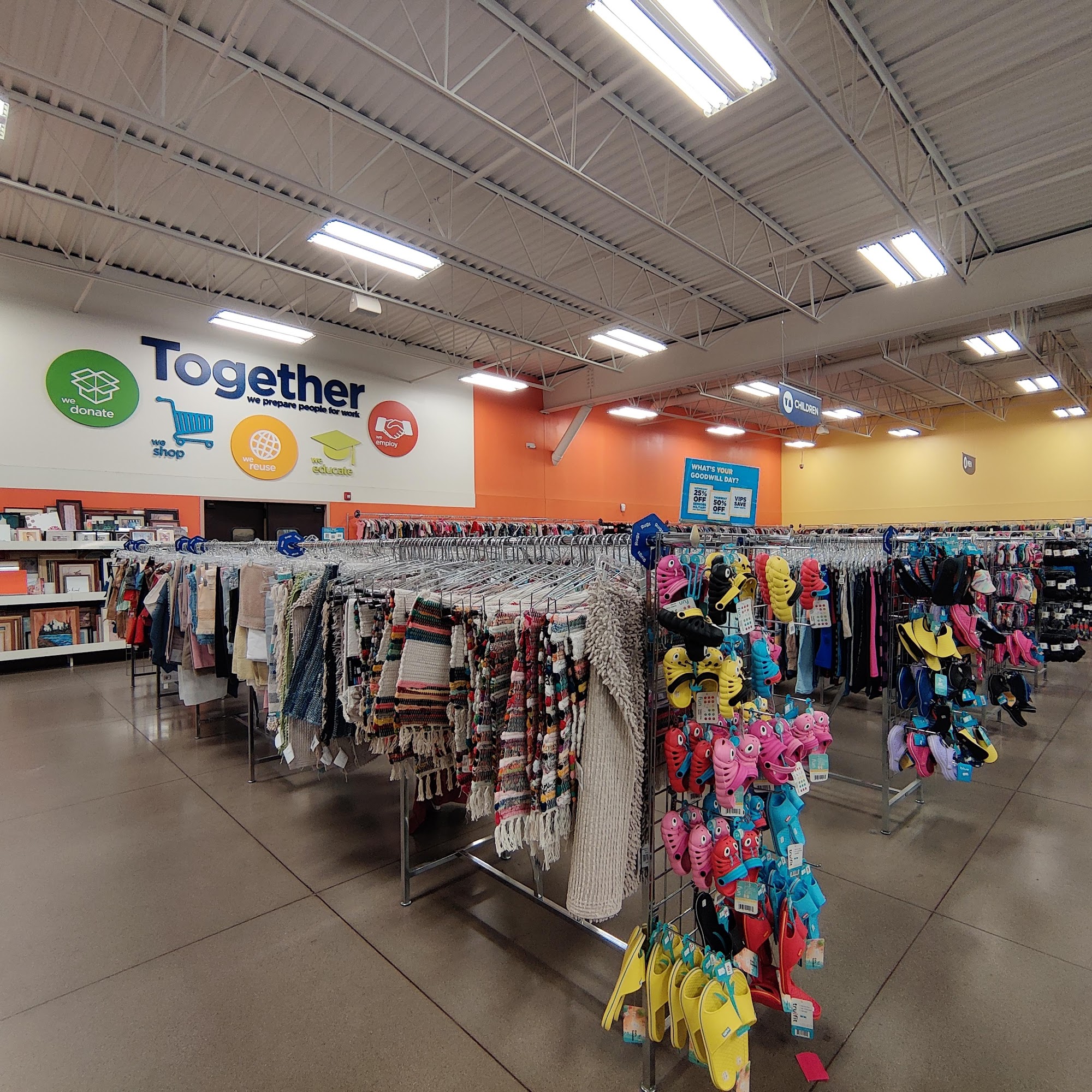 This Goodwill is a very nice location with a fantastic service and a very large selection. It offers many different items for many different ages, including clothing, household goods, and toys. The store is very clean and extremely well stocked, with lots to choose from in decent shape. Staff is usually friendly and super nice. The value and prices are depending on what you're buying, with some finding items fairly priced and lasting a long time, while others feel most items are overpriced. Note that there are no fitting rooms and the return policy is pretty bad.