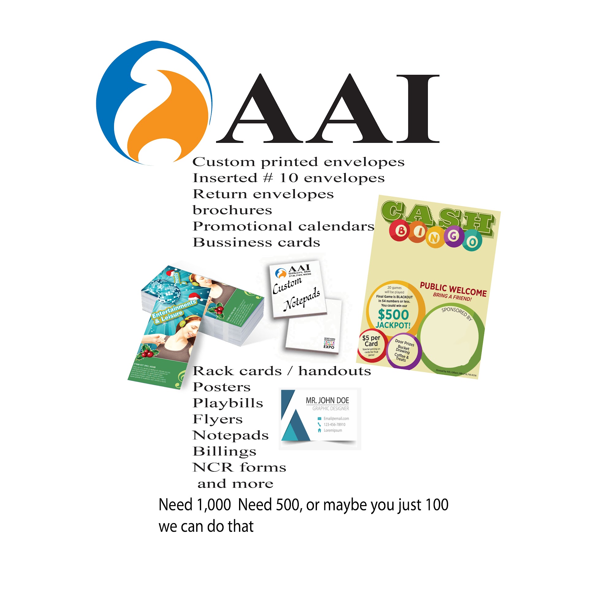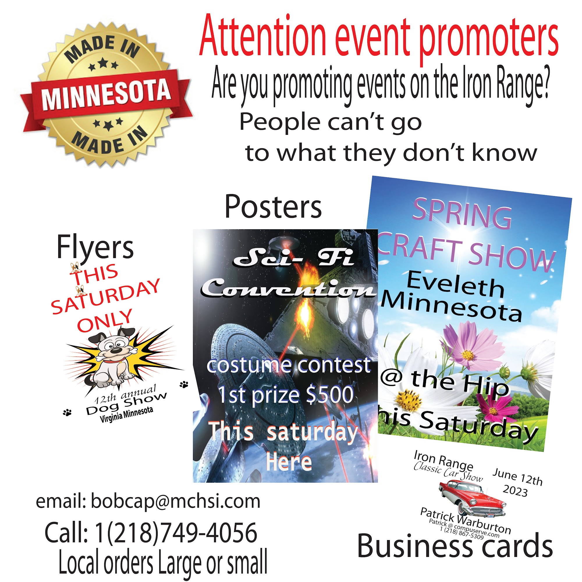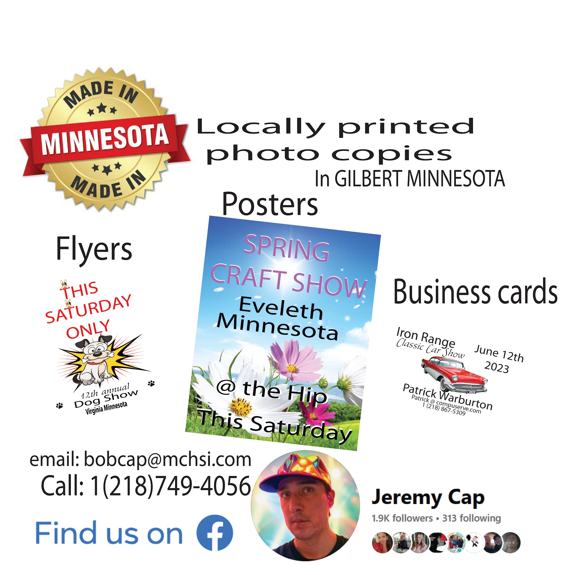 Family owned & operated 3 generations custom Printing and copies Need 1,000 or just 100 printed We can do that. Flyers, posters, business cards, custom envelopes, handouts, copies, mailings & more. Call for appointment. Started in 1971 as a concert sound company working with bands like Styx and many more Grammy winning nation acts, in 80s Also DJ for clubs weddings & casinos Sound systems for meetings and events. In the late 90s we added a printing company with flyers, posters, business cards, custom envelopes, copies, mailings & more Also promoters of Northern Minnesota Craft And Vendor Expo