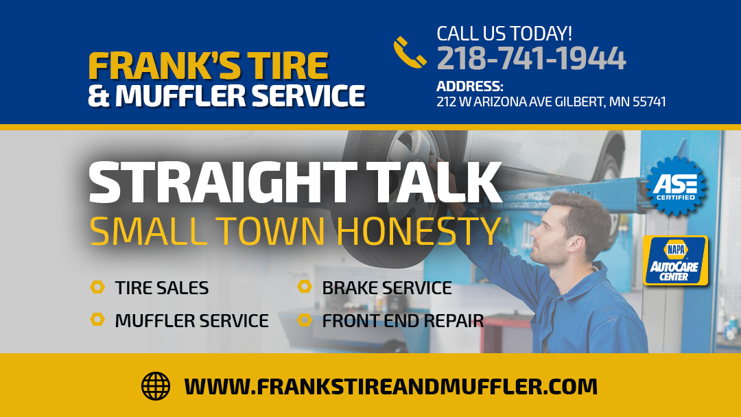 Frank's Tire & Muffler Services is a great business and a gem on the Iron Range, recommended for tires, suspension, or exhaust work. Customers report the best experience with fast, friendly, and prompt service, often completed the same day. The shop is customer-focused, with experts in their craft and service you will not experience at big box stores. They have a large inventory and are extremely fair and up front about costs, with fair prices and no swindling. Many have been loyal customers for over a decade, with some driving from out of the area. If you go once, you will never consider going anywhere else.